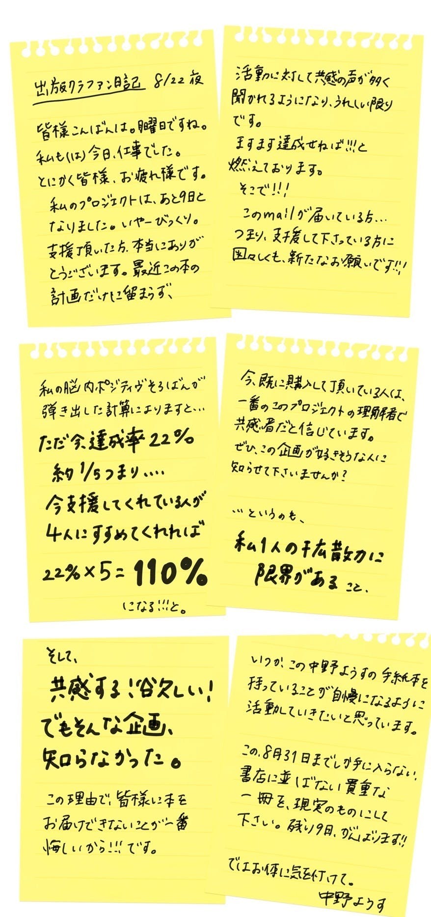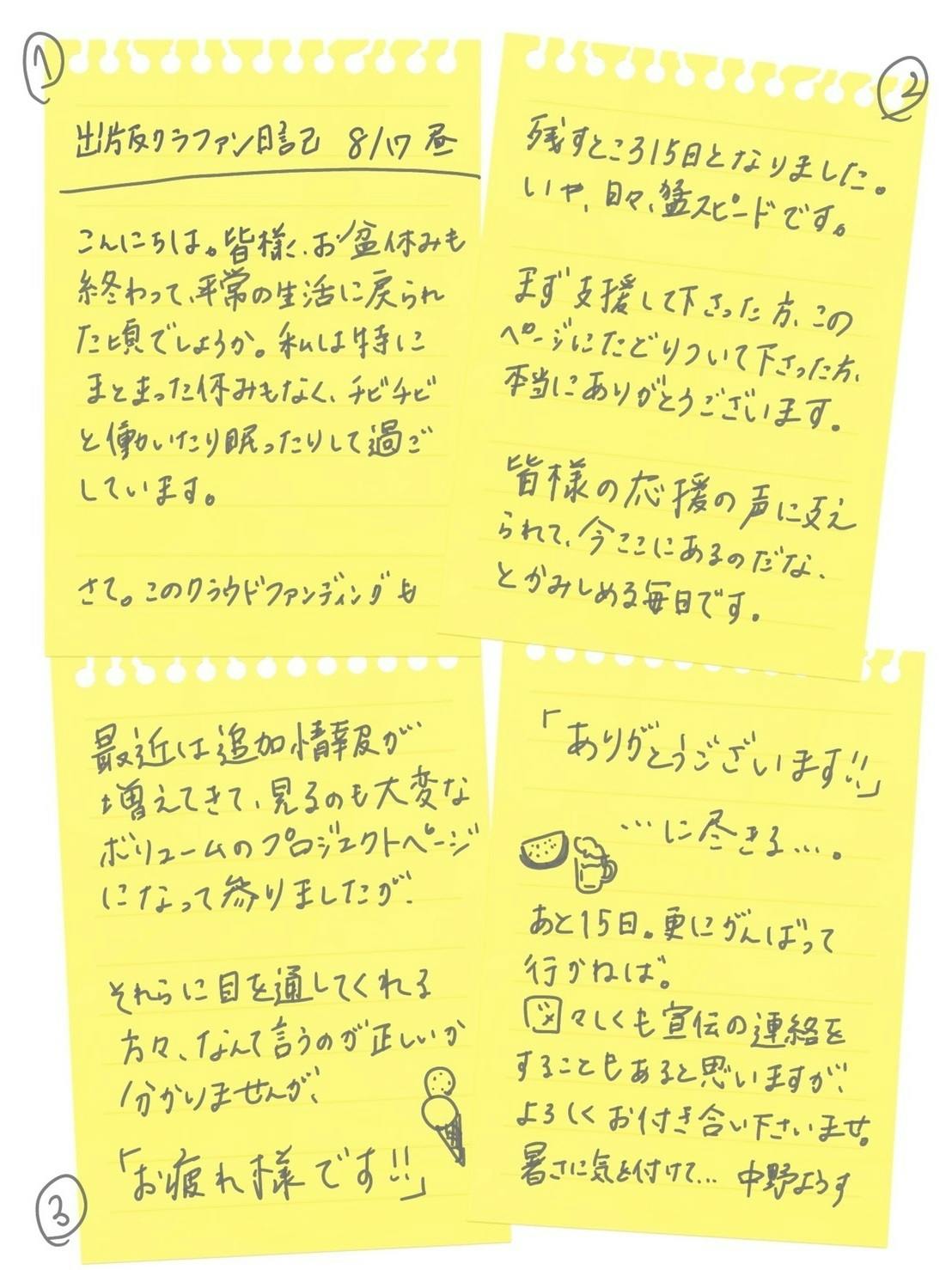 2022/09/01 00:00この度は、私の行っていたクラウドファンディングに支援・応援・拡散・ページへの来訪などたくさんのご協力を頂き、心から感謝しております。また、関わって下さった全ての皆様、この企画を採用して下さったEXODUSの関係者様、ありがとうございました。たくさんの方に支援、応援、興味を持ってくださり本当にありがたい日々でした。とても変わった体験で、1秒たりとも無駄ではなく学びの多い日々でした。大人になって、こんなに日々学ぶ時間を過ごすとは思いませんでした。本当に本当にありがとうございました。この先も見守って頂けたら嬉しいです。今後『一般人、女。40年分の手紙を全て公開する本。』をどこかしらで出版できたあかつきには、今回のクラウドファンディングで支援くださった方に何かお礼をしたいと考えております。支援した際の確認メールを保存、又はスクリーンショットを保存しておいていただきたいです。どういった形でお礼できるか分かりませんが、よろしくお願いいたします。2022.09.01 中野ようす もっと見る