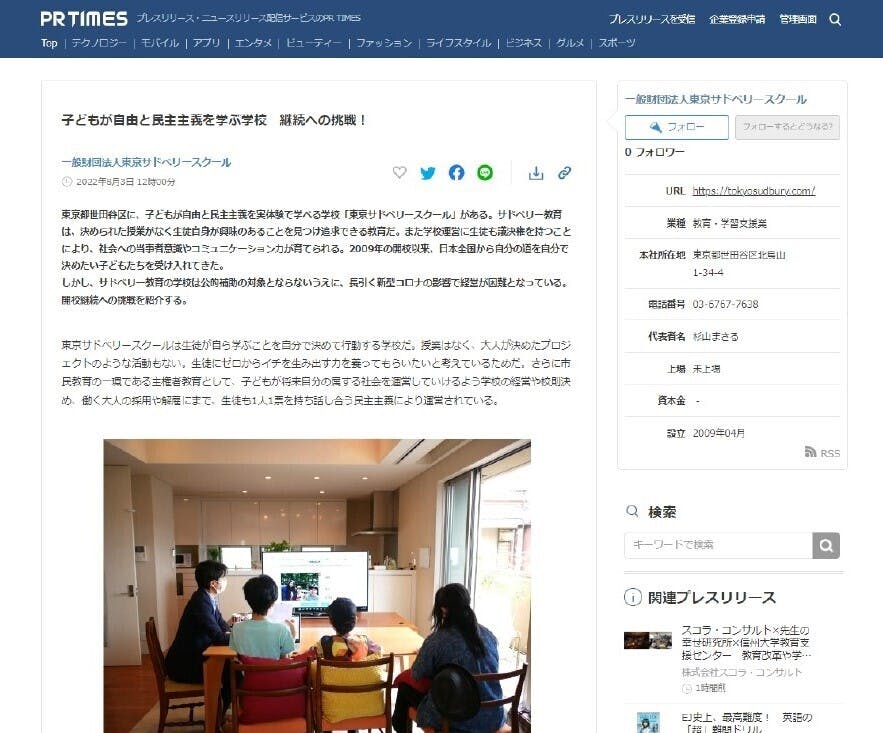 プレスリリース配信会社、PRTIMES(ピーアールタイムズ)様にて、東京サドベリースクールのクラウドファンディング開校継続の挑戦を掲載させていただきました。