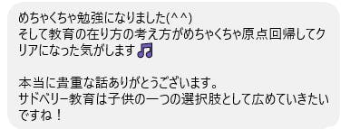 「昨日は、ありがとうございました。とても学びの多い時間となりました。サドベリーは素晴らしいと思いましたが、それ以上に自分の子にあった、才能が発揮される環境となる教育の場がないか考え続けたいと思いました。あとは、杉山さんになら安心して子を預けられると思いました。そういう教育者と巡り会えるというのは幸せですね。」