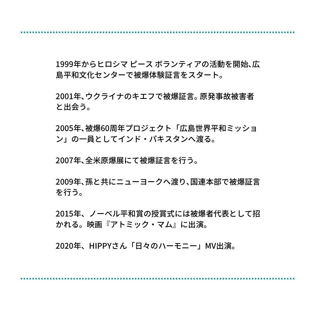近年では、ヒバクシャ国際署名、核兵器禁止条約採択のための緊急行動、その他にも原爆関係以外の国際活動へも積極的に関わり、世界各地で活動していました。