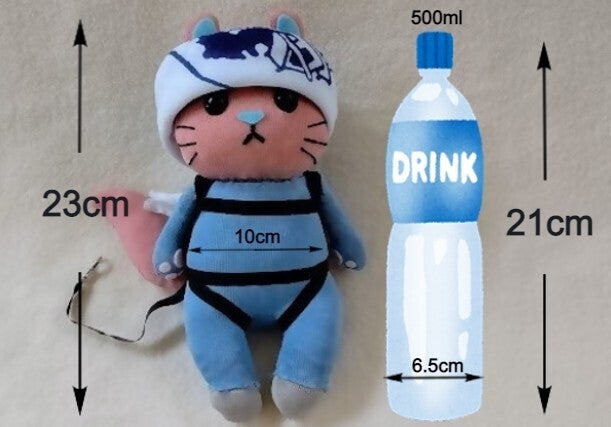 なお、現段階で自作【猫職人】ぬいぐるみには修正箇所があります。本来手の部分はピンク色で肉球が付いているはずですが、水色の服の上に肉球を付けてしまっています。ミスりました、すみません。こちらは見積もり時に、すでに修正をお願いしています。また、フルハーネス型安全帯+ランヤードですが、自作品ではマスキングテープと金具(Dカン・ナスカン)で表現しています。これらの材質は変わるかと思いますが、デザイン自体が変わることはありませんのでご了承ください。もう一点、頭に巻いている手ぬぐいですが、こちらは画像と違う絵柄になります。(サイズは同じ)ぬいぐるみから取り外すことができ、ハンカチとしても使用して頂ける手ぬぐいを専門業者さんに発注しますので、ご了承ください。