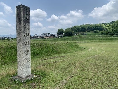 山田寺跡の石碑です。向こうに見えるのが私の住む山田村です。