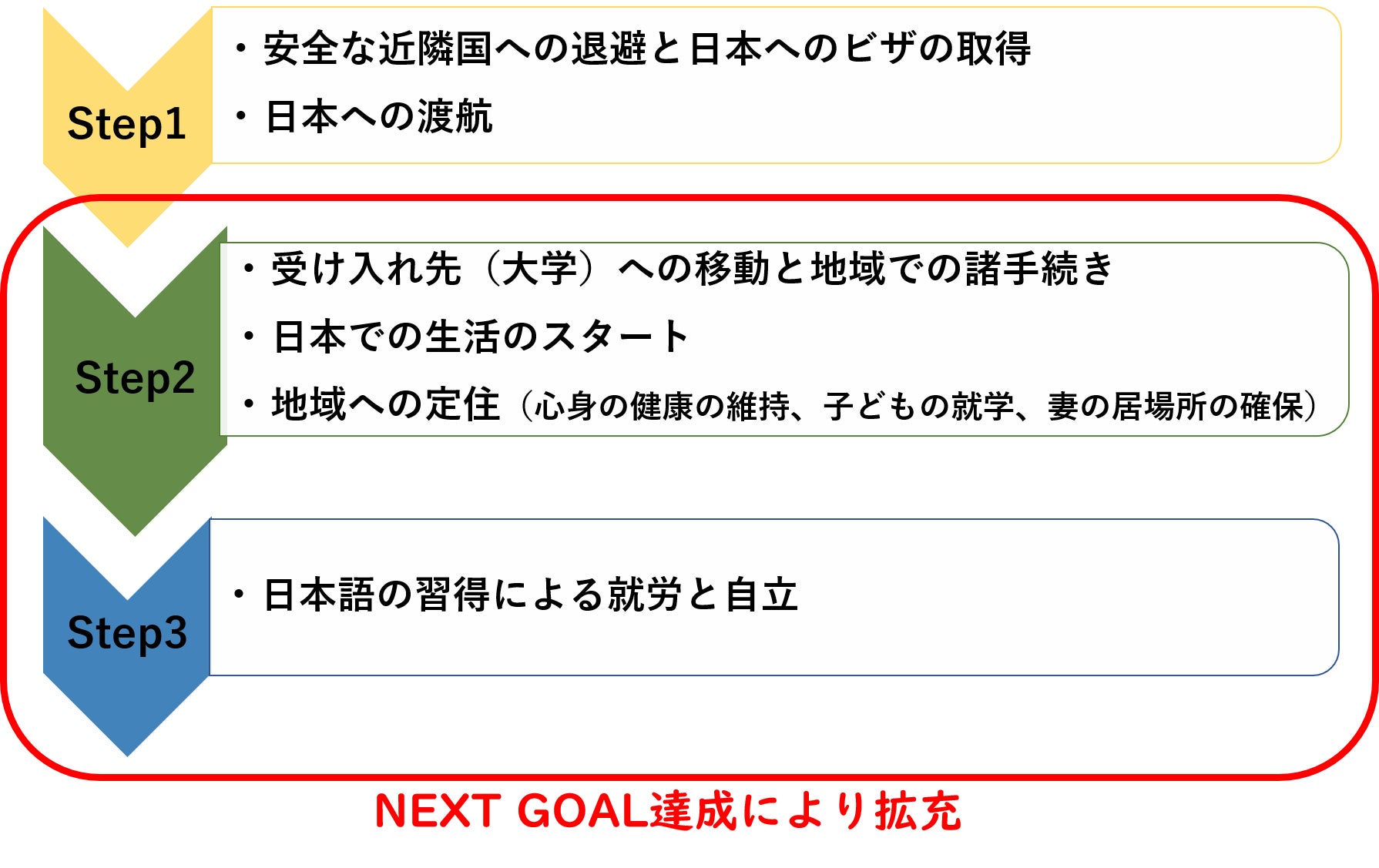 退避を求める元留学生の命、来日は果たしたもののまだ先を見通せない状況で暮している家族の尊厳を守るために、NEXT GOALの達成を諦めるわけにはいきません。