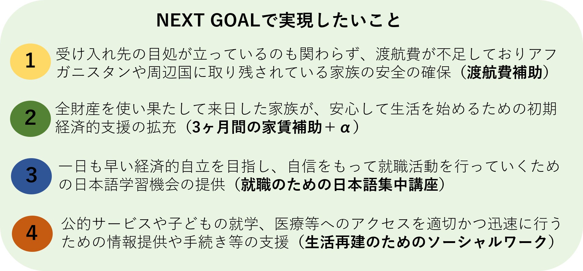 来日を果たしたご家族の想い、そして、今なお安全が確保されていない家族が残されている状況を受け、NEXT GOALとして設定した600万円(300万円の増額分)は、以下のように使用したいと考えています。