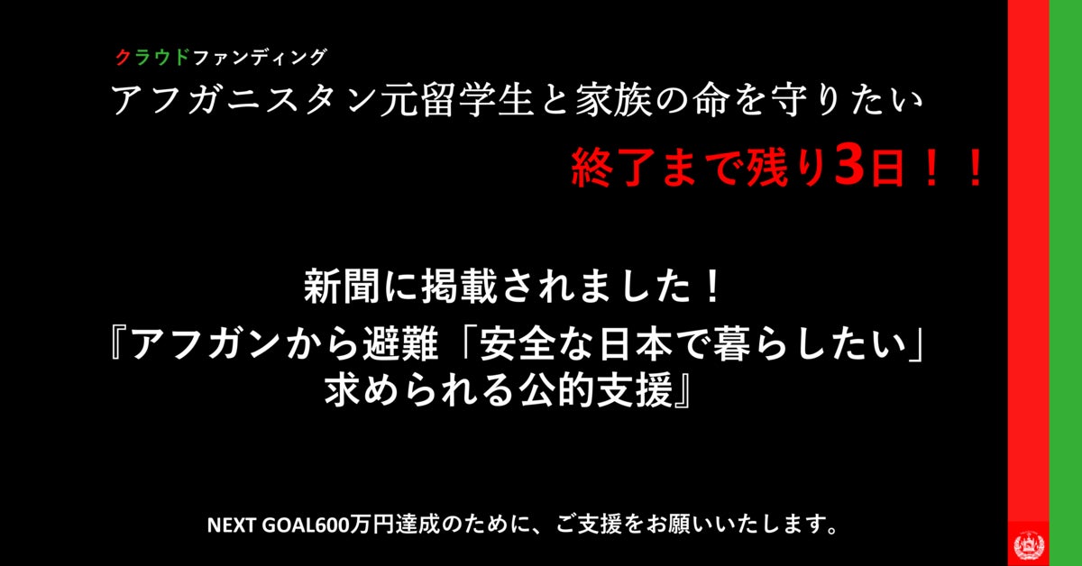 プロジェクト終了まで残り3日!8月27日付の毎日新聞に、プロジェクトチームメンバーである宮崎大学の先生方の支援により来日を果たした元留学生に関する記事が掲載されました!https://mainichi.jp/articles/20220827/k00/00m/030/173000c?fbclid=IwAR36hNzG8stdBccBfEJJAC_nEnvpf-94LijUdHc7NlgtunWFhT3-FOgL8eI(毎日新聞デジタルに移動します。どなたでもご覧いただけます!)宮崎大学ではこれまでに、元留学生5名とその家族、計26名の退避を実現させています。プロジェクトメンバーの大澤先生らによると、今なお退避支援を求める声は寄せられ続けているそうです。そして、退避することができた5家族も、母国に帰りたくてもしばらくは帰ることができないため、安定的な就労による在留資格の更新を続けていくことへの不安を抱えていると言います。命を守るため、日本に逃れざるを得なかったアフガニスタン元留学生が、安心して生活再建をスタートさせるためには、適切な初動支援が欠かせません。それらの支援を充実させるためのNEXT GOAL達成に向けて、皆さまのご支援をよろしくお願い申し上げます。
