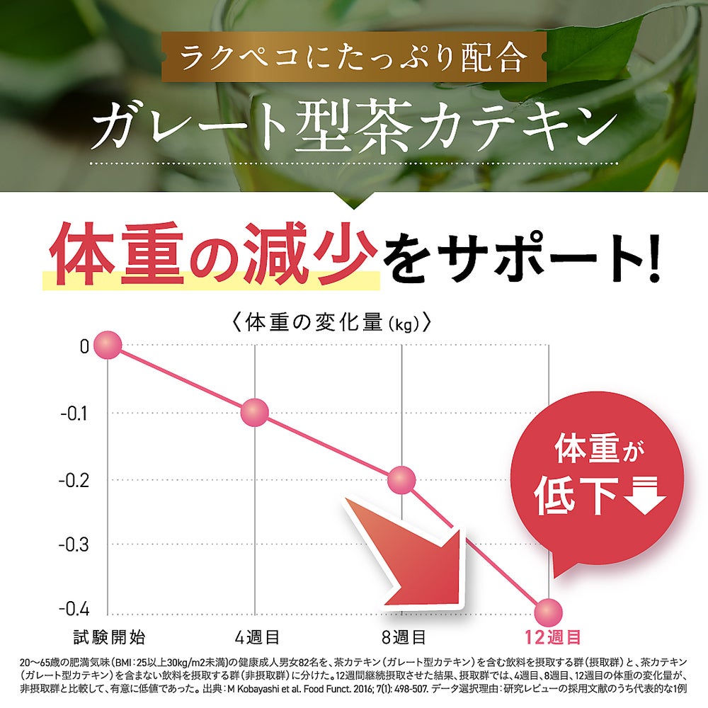 肥満気味な方のお腹まわりの脂肪(内臓脂肪、皮下脂肪)を低下させ、体重の減少をサポートし、高めのBMIを低下させる