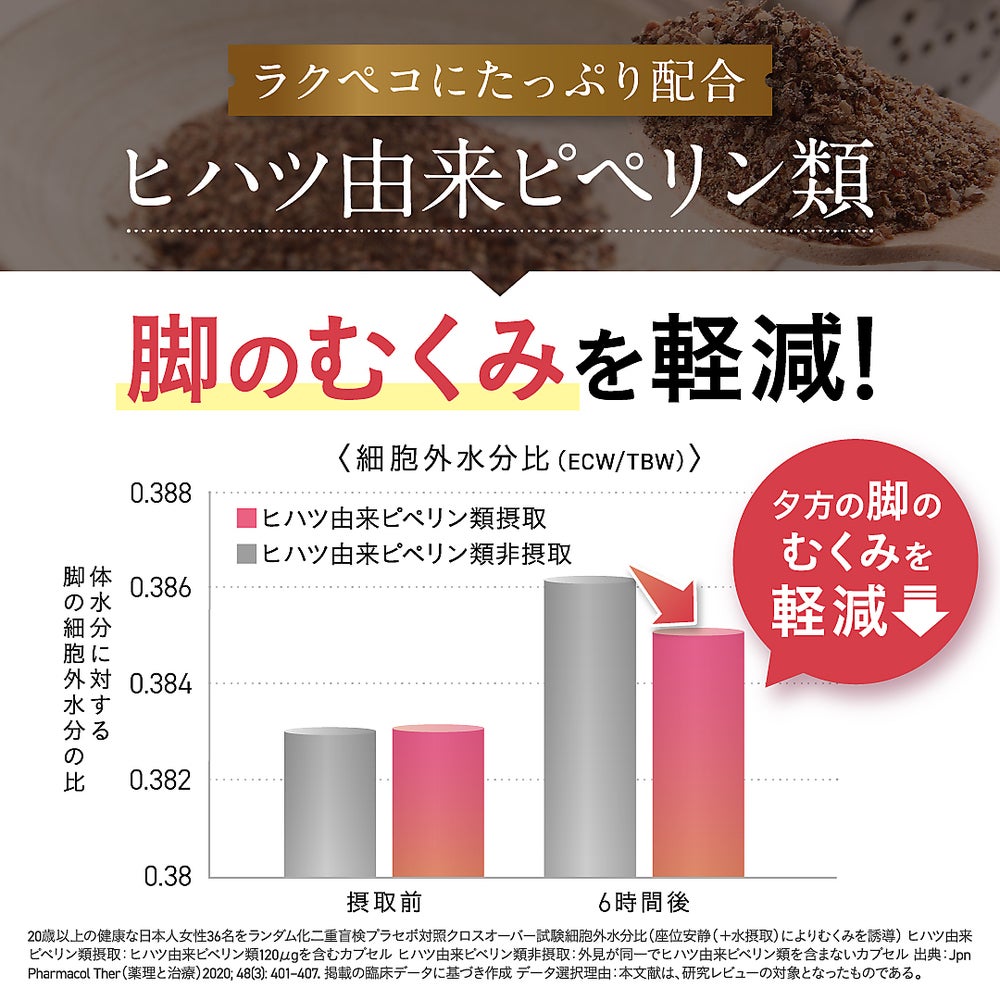 機能があることが報告されています。ヒハツ由来ピペリン類は、脚のむくみが気になる健常な女性の夕方の脚のむくみ
