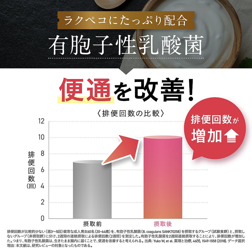 が含まれます。有胞子性乳酸菌(B. coagulans SANK70258)は、生きて腸まで届き、便通が気になる方の便通を改善する