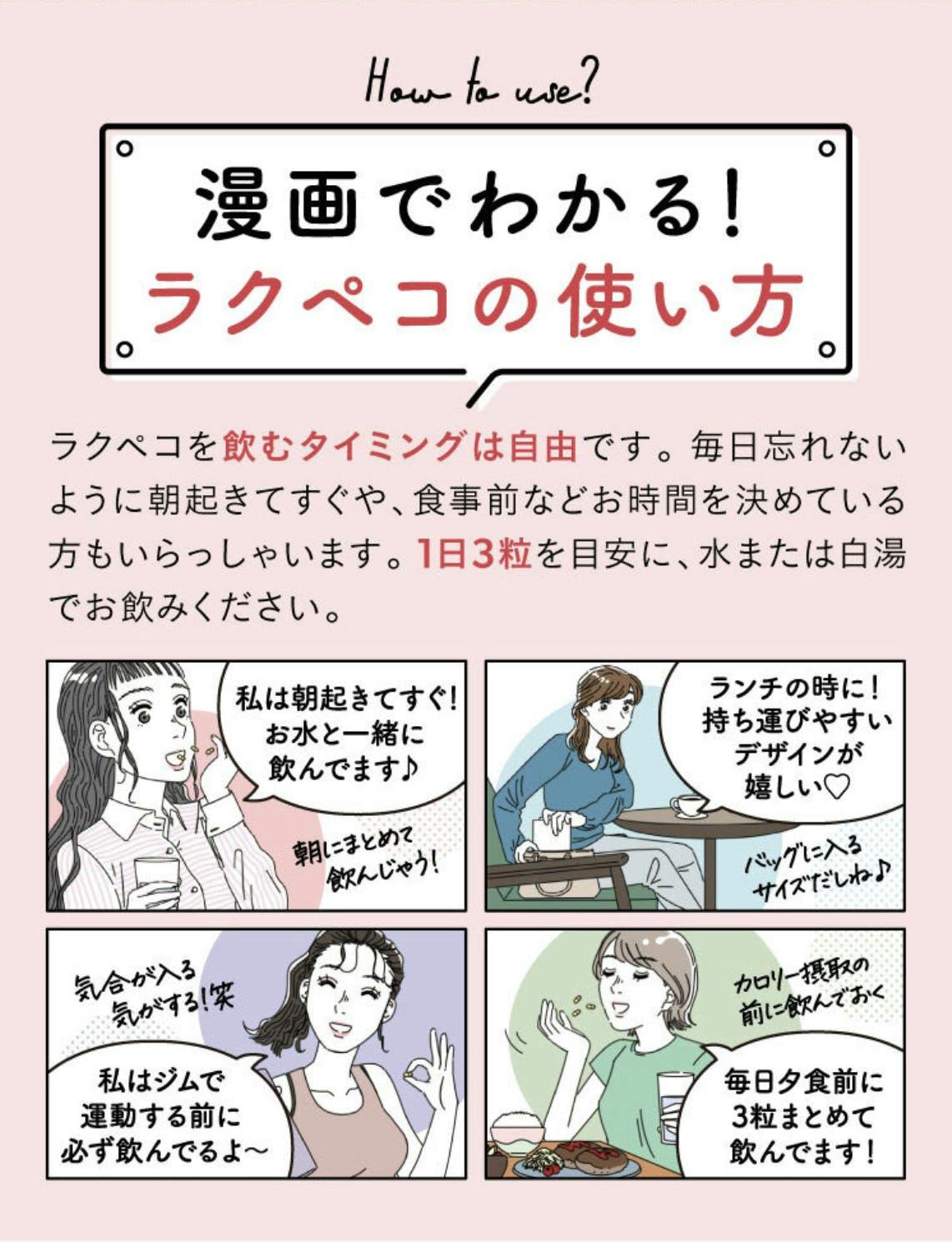 A:決められた飲用時間やタイミングはありません。 毎日忘れないように朝起きてすぐや、食事前などお時間を決めている方もいらっしゃいます。 1日3粒を目安に、水または白湯でお飲みください。