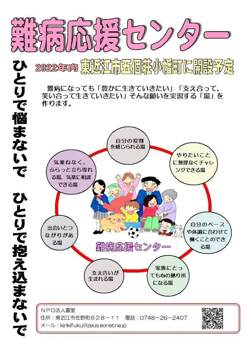 私たちは、持続可能な東近江市をつくる活動をされている方々を応援するコミュニティファンドです。本事業は、難病で苦しむ方が、地域の中で人とつながり、安心して暮らし働くことを応援しようという民間公益活動で、休眠預金を活用した当基金の助成事業で支援しています。