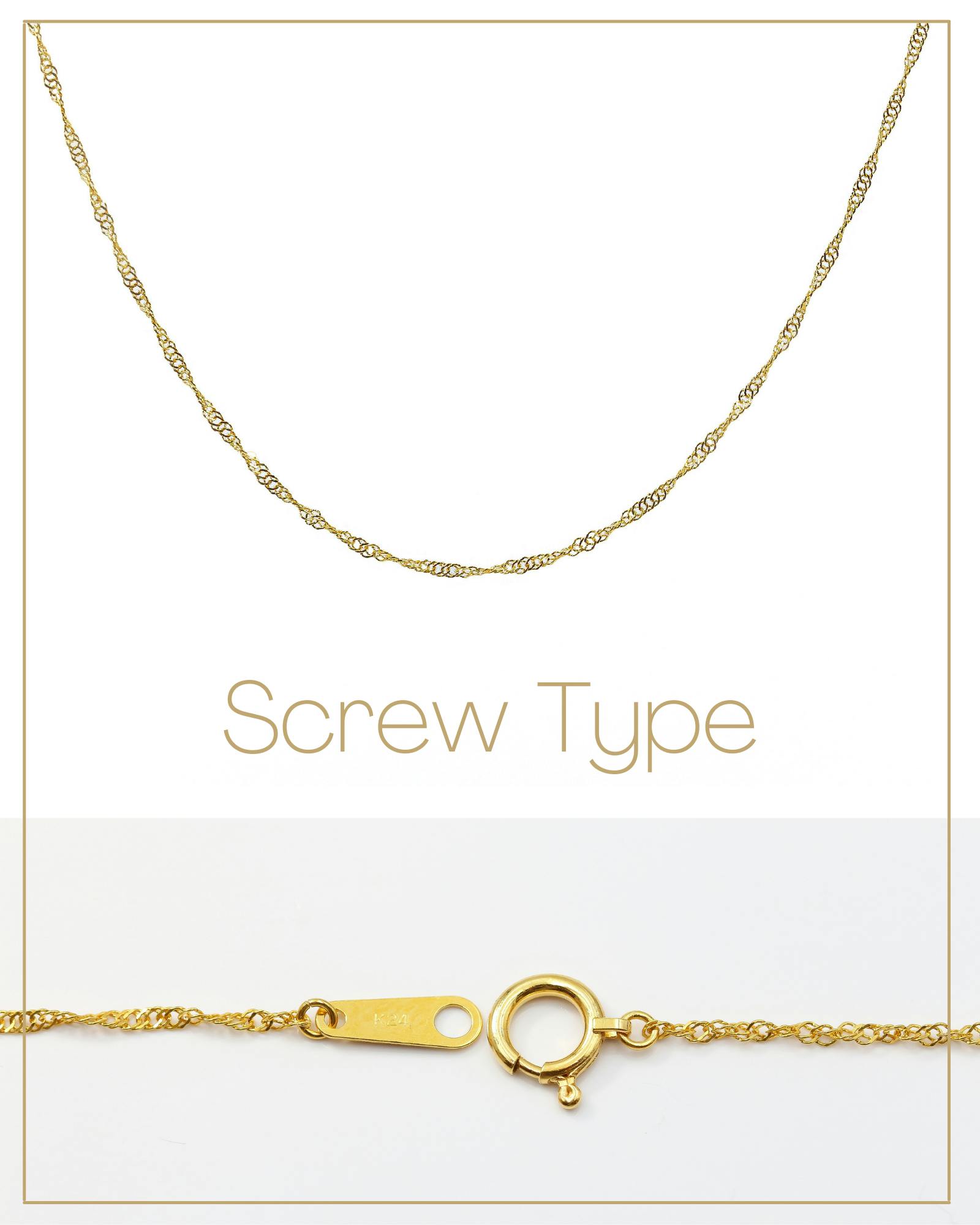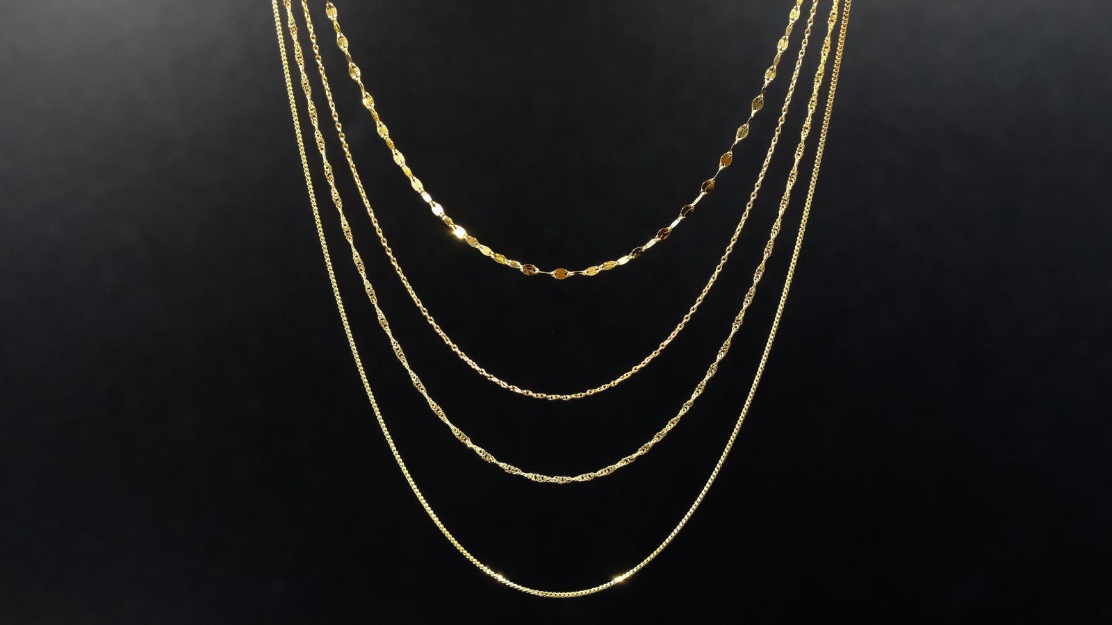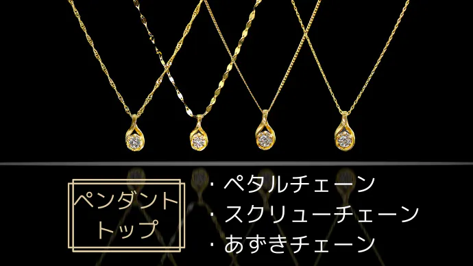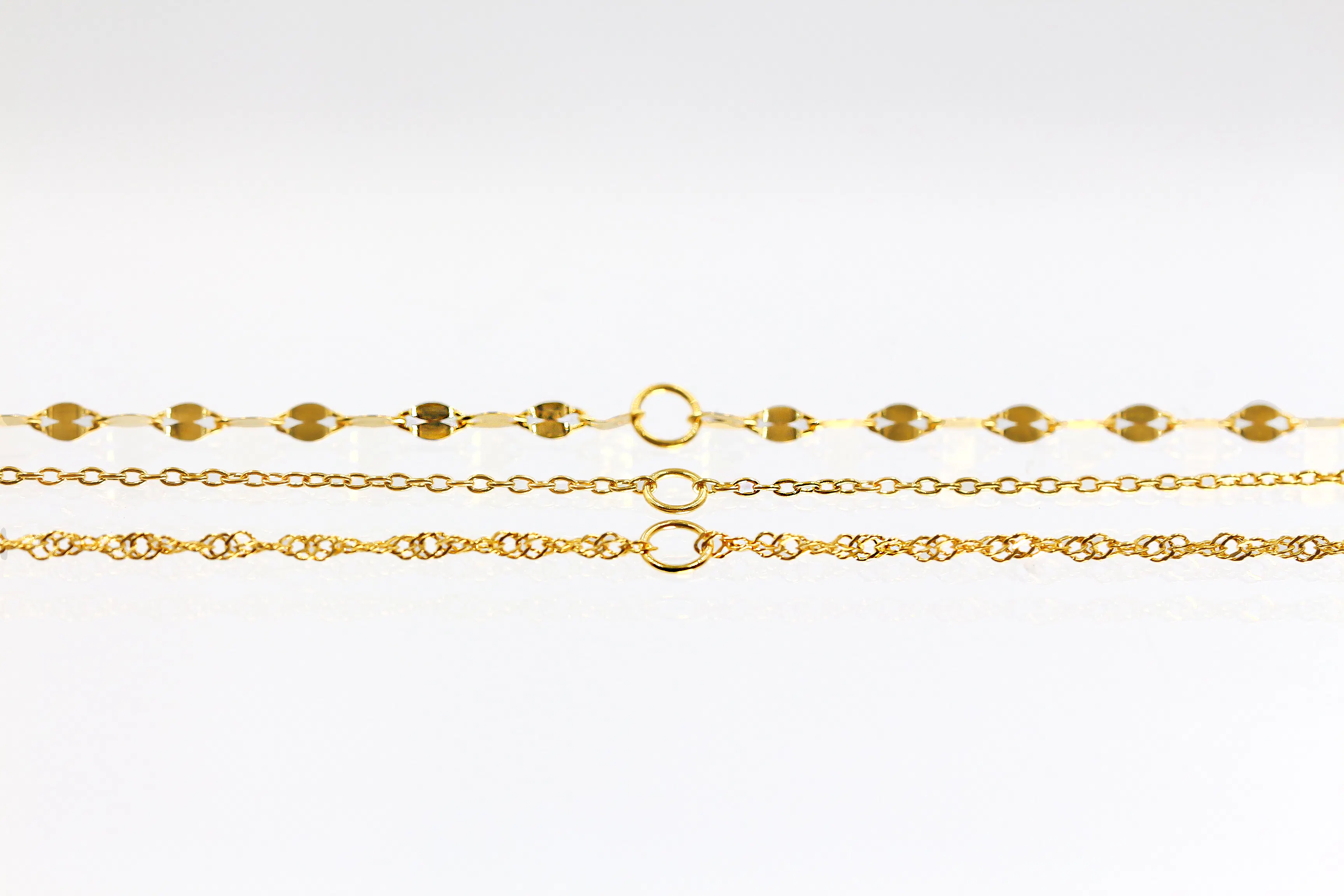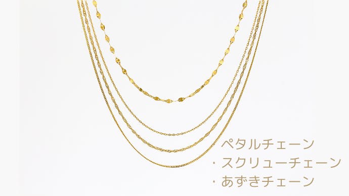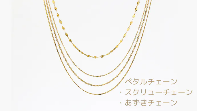 *画像 左から スクリューチェーン/小豆チェーン/喜平チェーン/ペタルチェーン