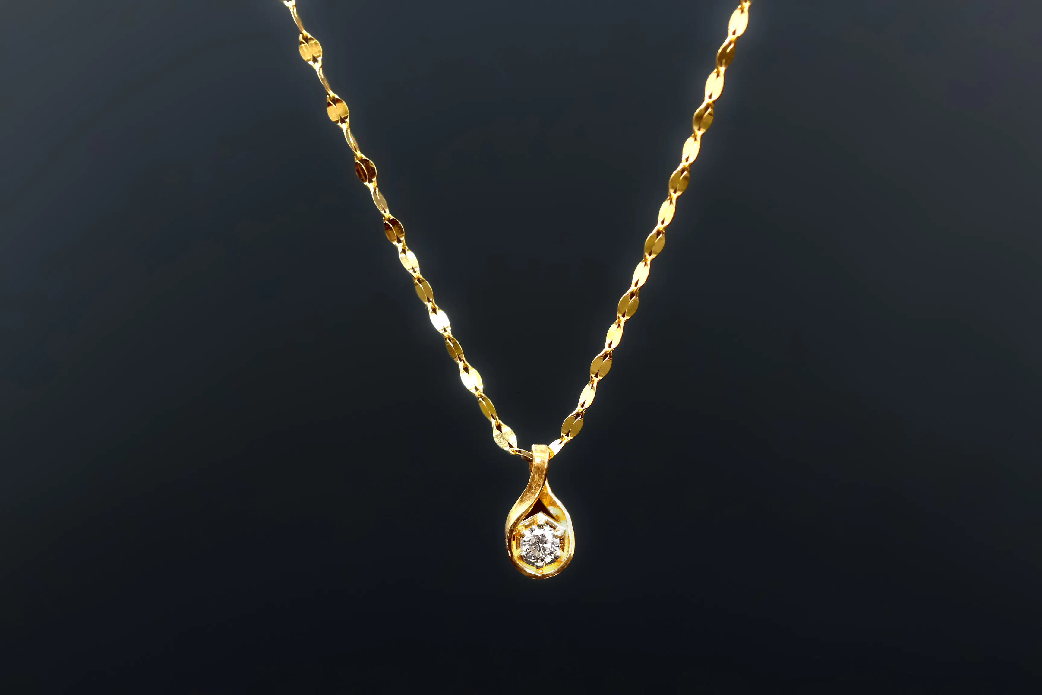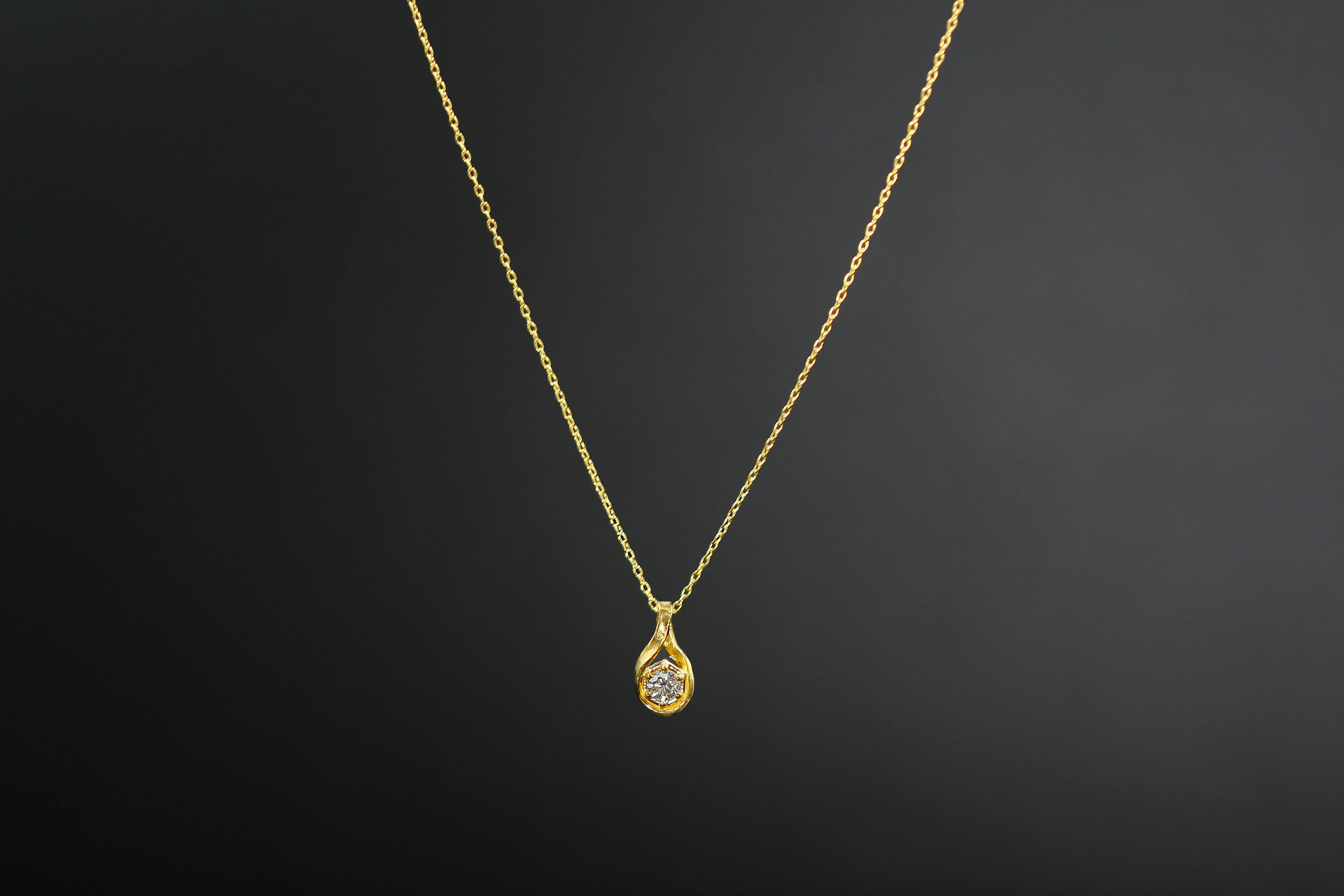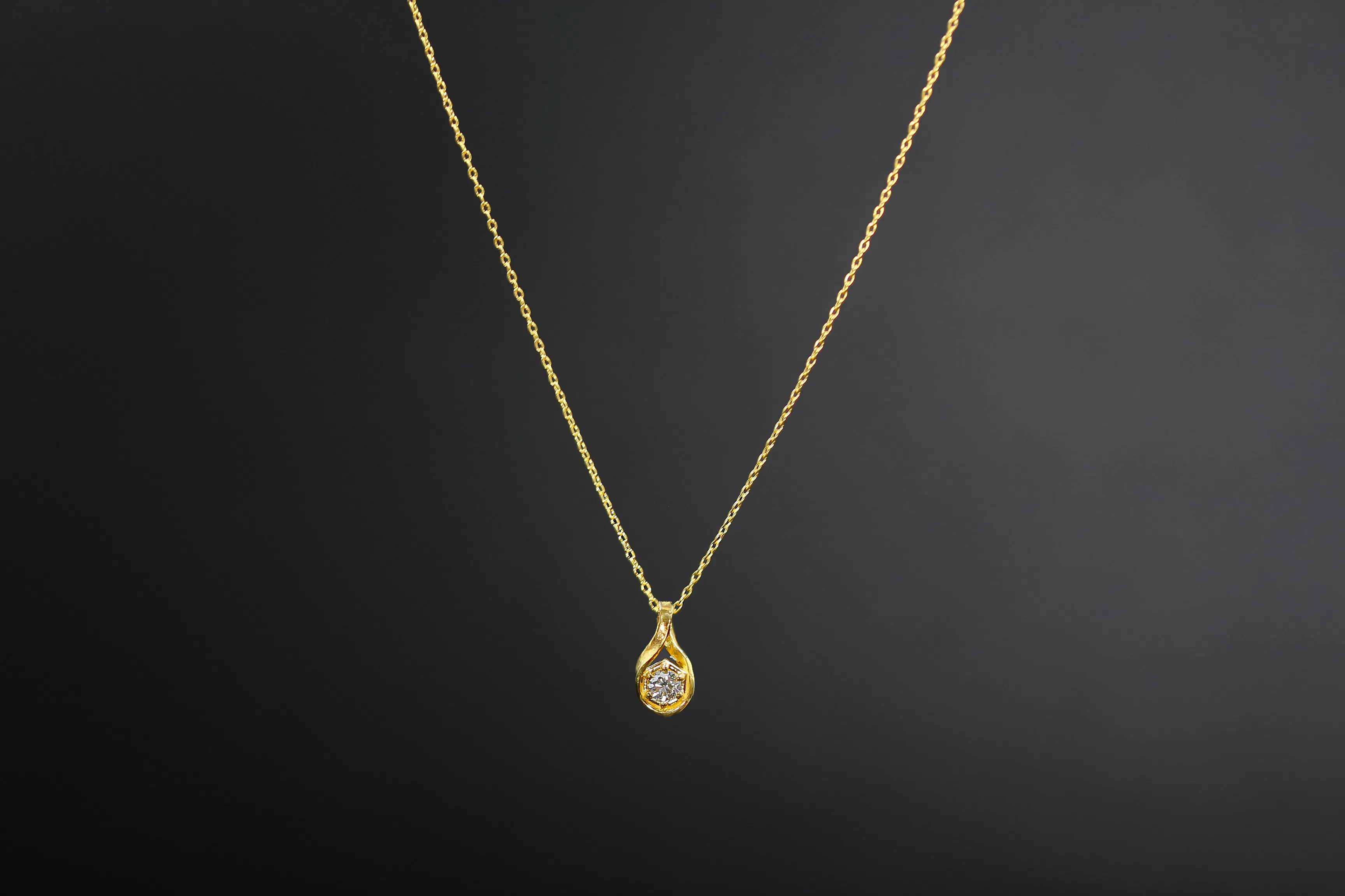 独特の色合いや輝きを持つ「純金」とシンプルな「天然ダイヤモンド」の組み合わせのペンダントトップは、意外と珍しく、純金の色合いや輝きを引き立たせるデザインになっています。
