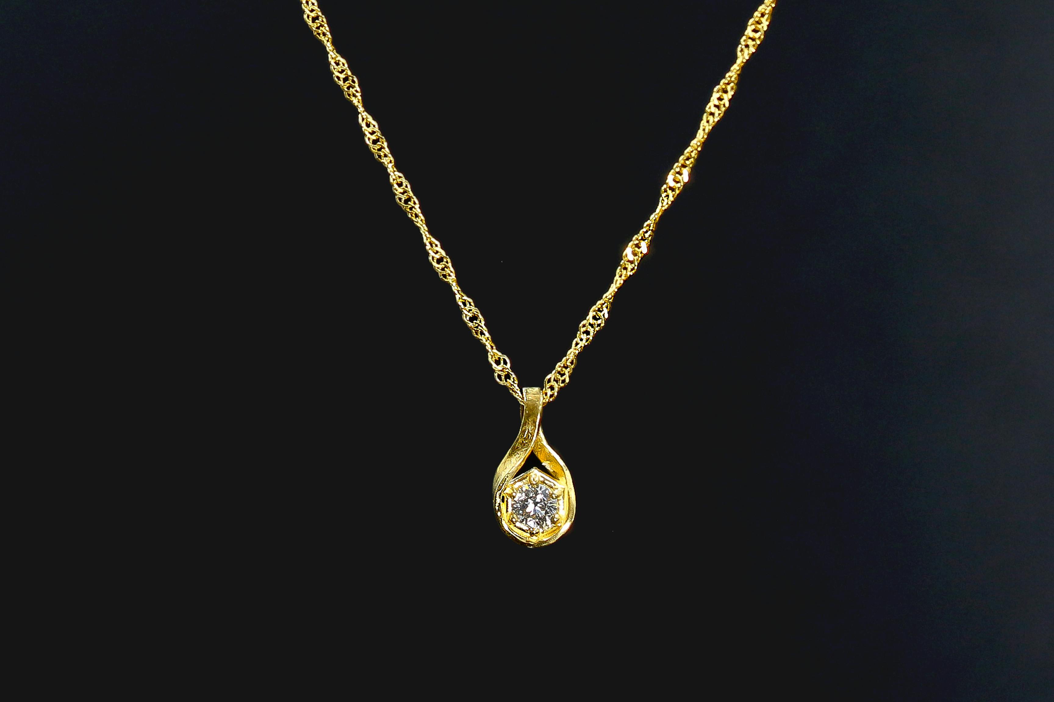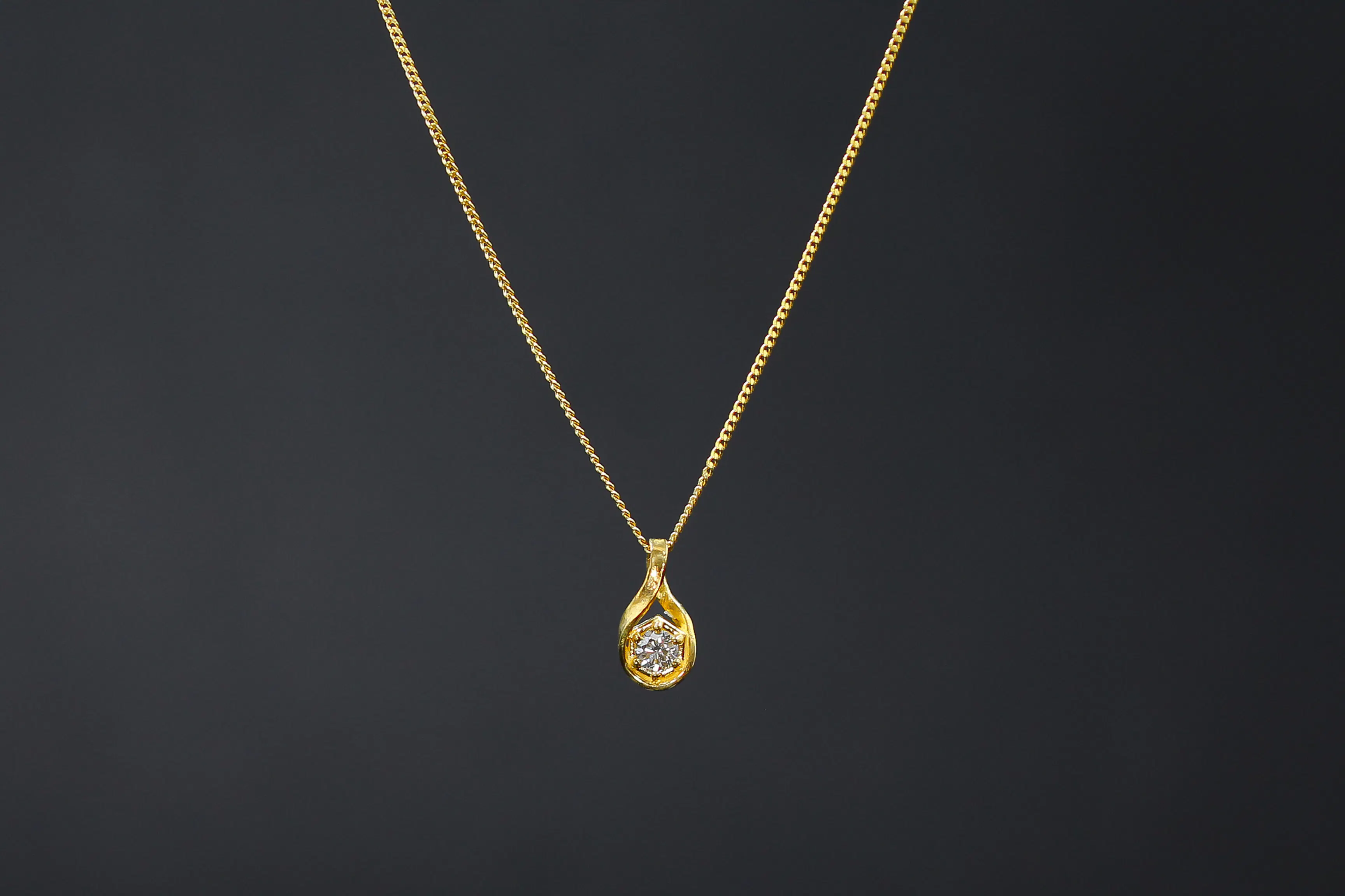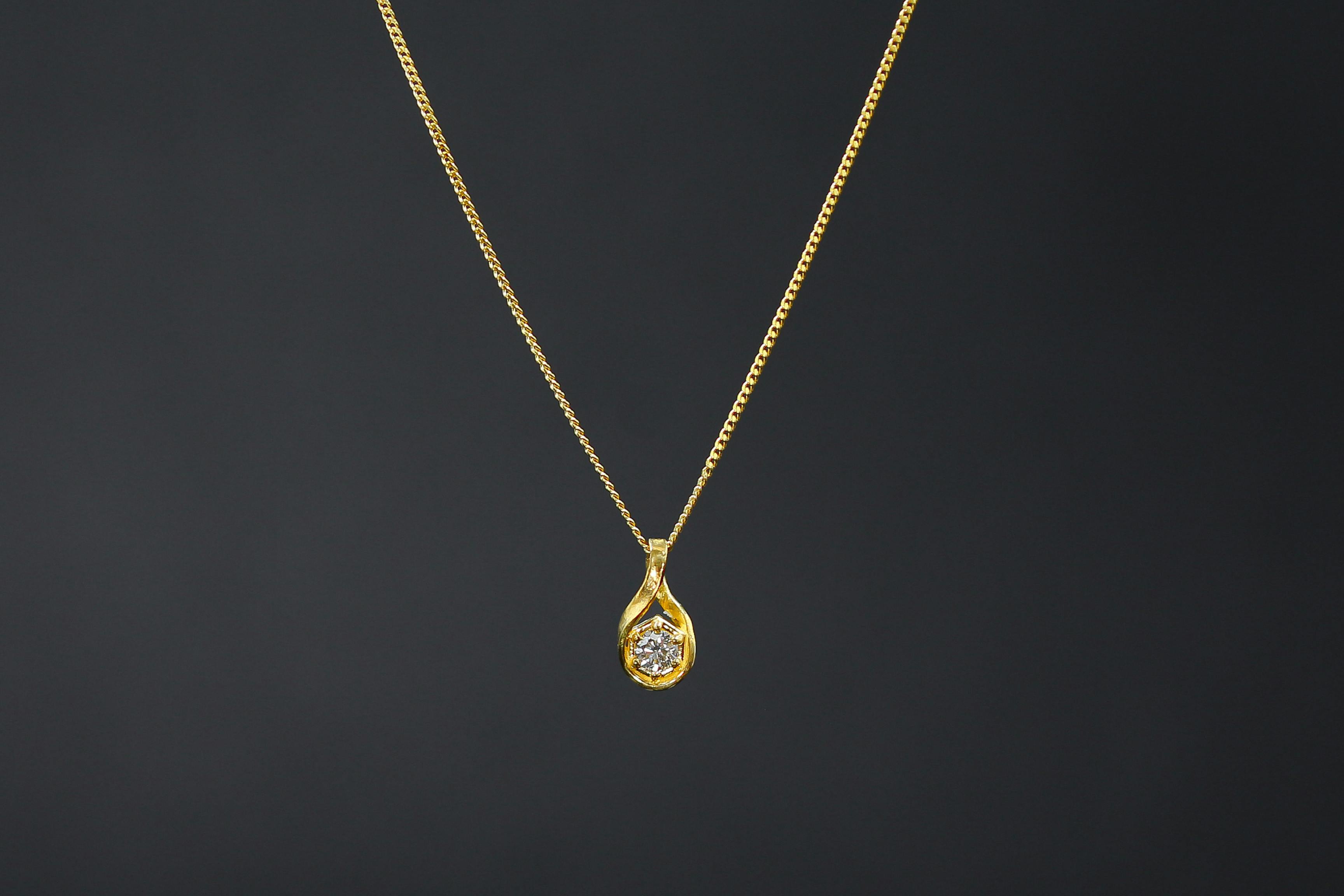 独特の色合いや輝きを持つ「純金」とシンプルな「天然ダイヤモンド」の組み合わせのペンダントトップは、意外と珍しく、純金の色合いや輝きを引き立たせるデザインになっています。