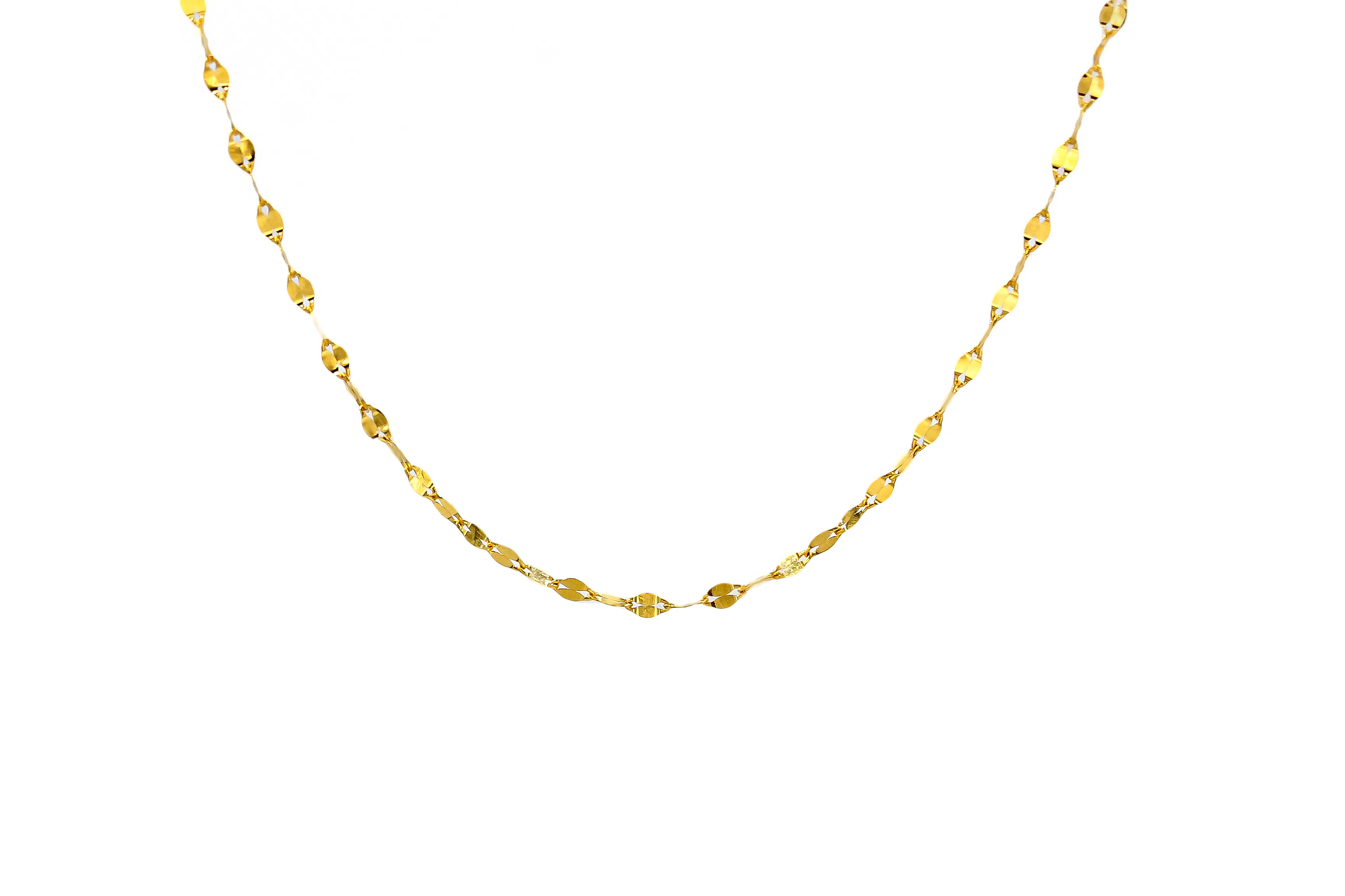 正面を向いたコマと、横を向いたコマが交互に連結しているのが特徴の小豆チェーンは、小さなコマがキラキラと反射するので、さりげなくて繊細な輝きが楽しめるチェーンです。