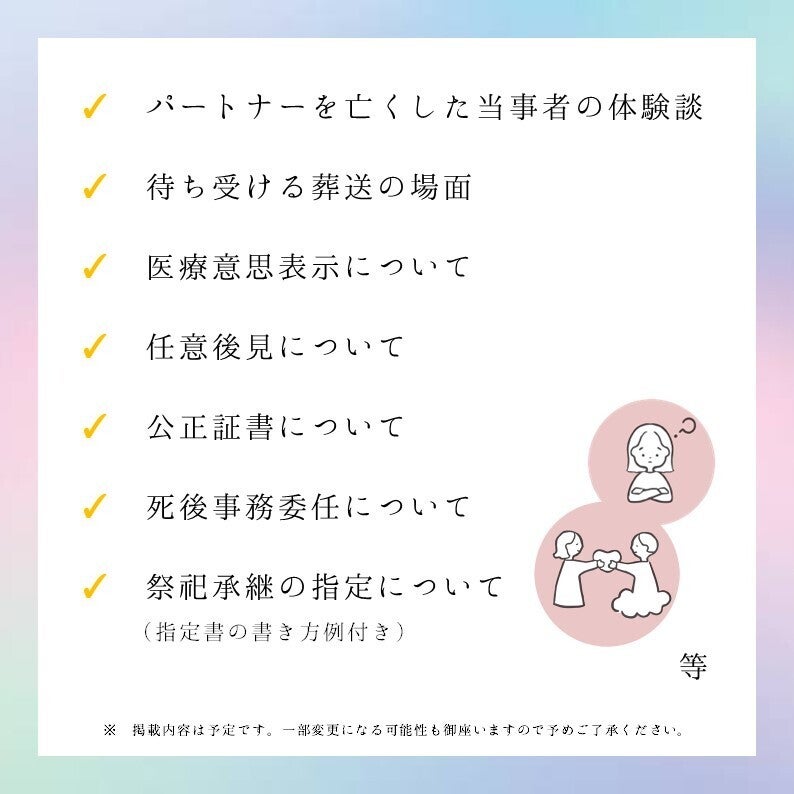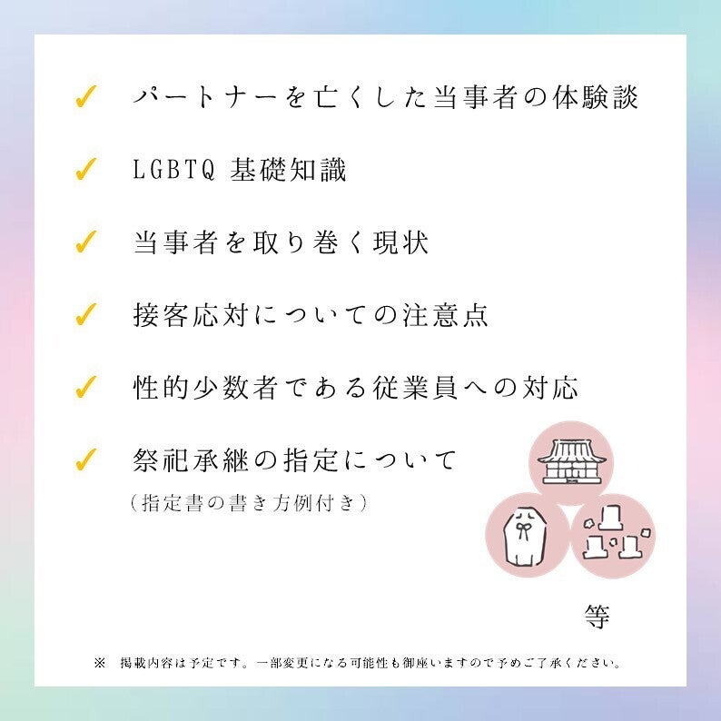 万が一の時、性的少数者の方が望む葬送を行うためには、業界全体へ理解と対応を促していくことと同時に、当事者自身も知識を身に着け、自らを守る行動が必要です。