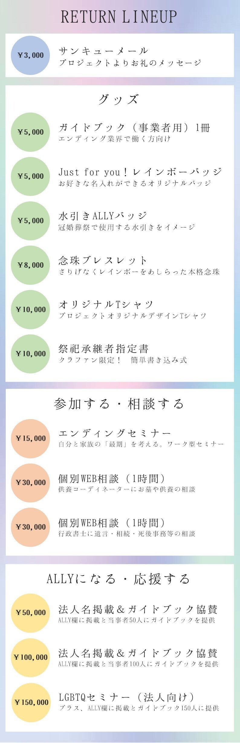 当初、私一人でスタートしたこのプロジェクトは、エンディング業界の枠を越え、核となる有志のメンバーが6名に増えました。そして各地域のLGBTQ支援団体さんや、ALLYな僧侶、医師、弁護士、行政書士の先生方の力強いサポートを頂けるまでのプロジェクトとなったのです。