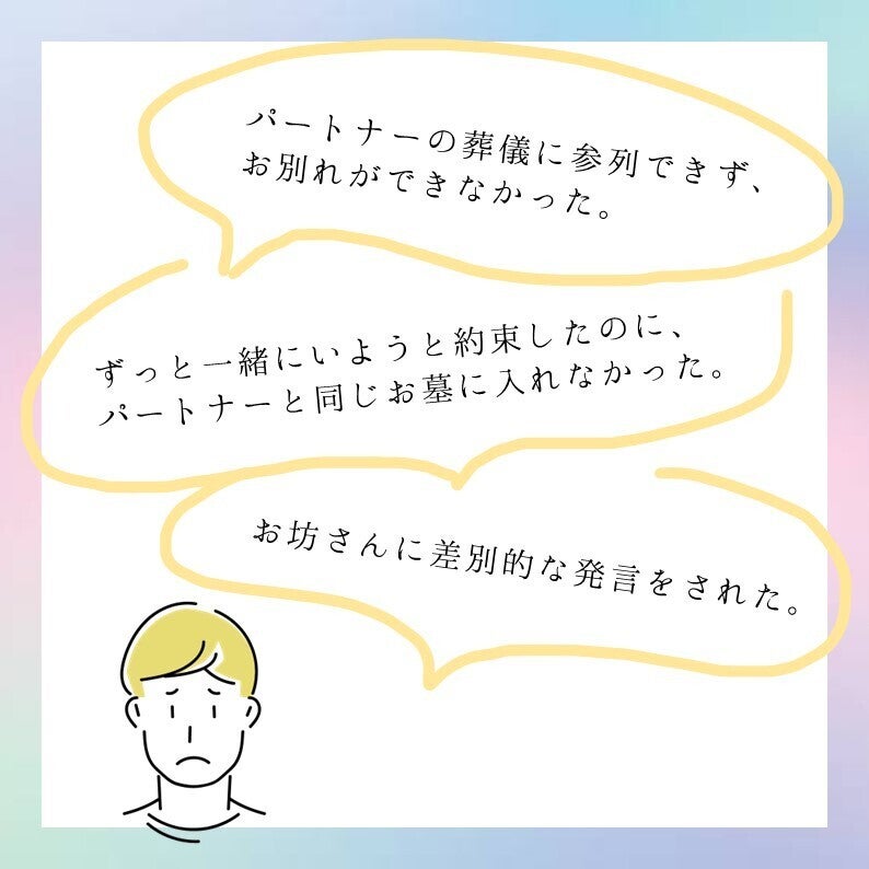 同性婚が認められたり、性的少数者への理解が進めば、こうした問題も解決へ向かうかもしれませんが、その間にも待ったなしで多くの当事者の方が亡くなっていくのです。