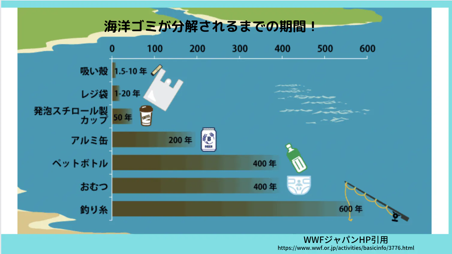 釣り糸(600年)おむつ(400年)ペットボトル(400年)