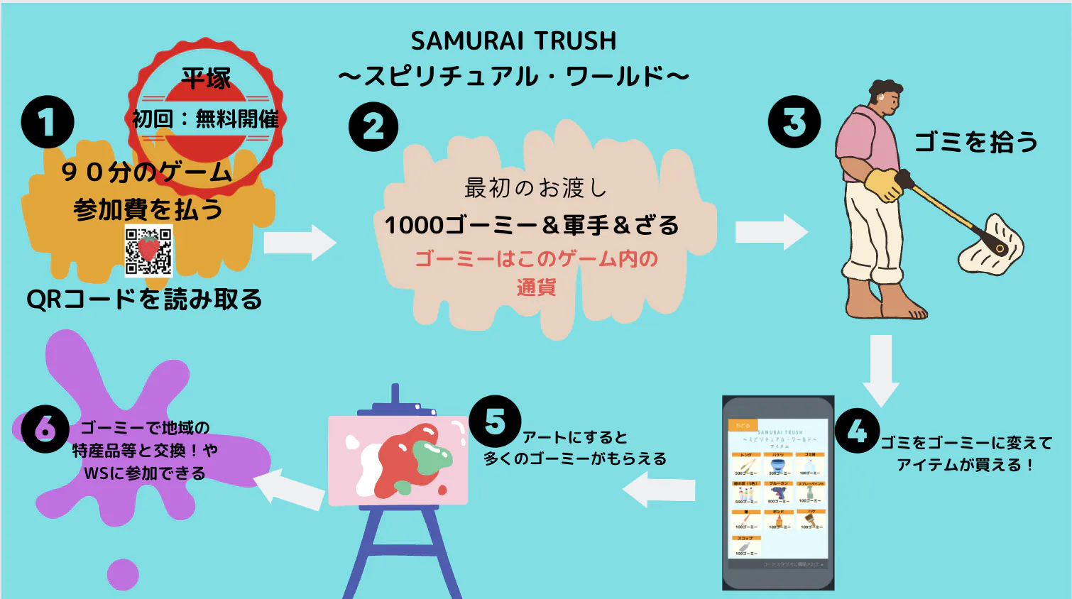 株式会社mocoEarth代表の細井と申します。小学生起業家のmocomocoと親子起業をして1年。私たちは、主に海洋汚染の問題に取り組んでいます。この地球上の問題を、小さな子にも楽しく学び、行動に移してもらえるようにWS(ワークショップ)や展示会を行ってきました。その中でみんなに「自分ごとして捉えてもらうにはどうしたら良いのだろうか?」と考え続けました。そこで生まれたのが「SAMURAI TRUSH〜スピリチュアルワールド〜」(サムライトルッシュ〜sスピリチュアルワールド〜)アプリ×ゴミ拾い×アートの遊びです。
