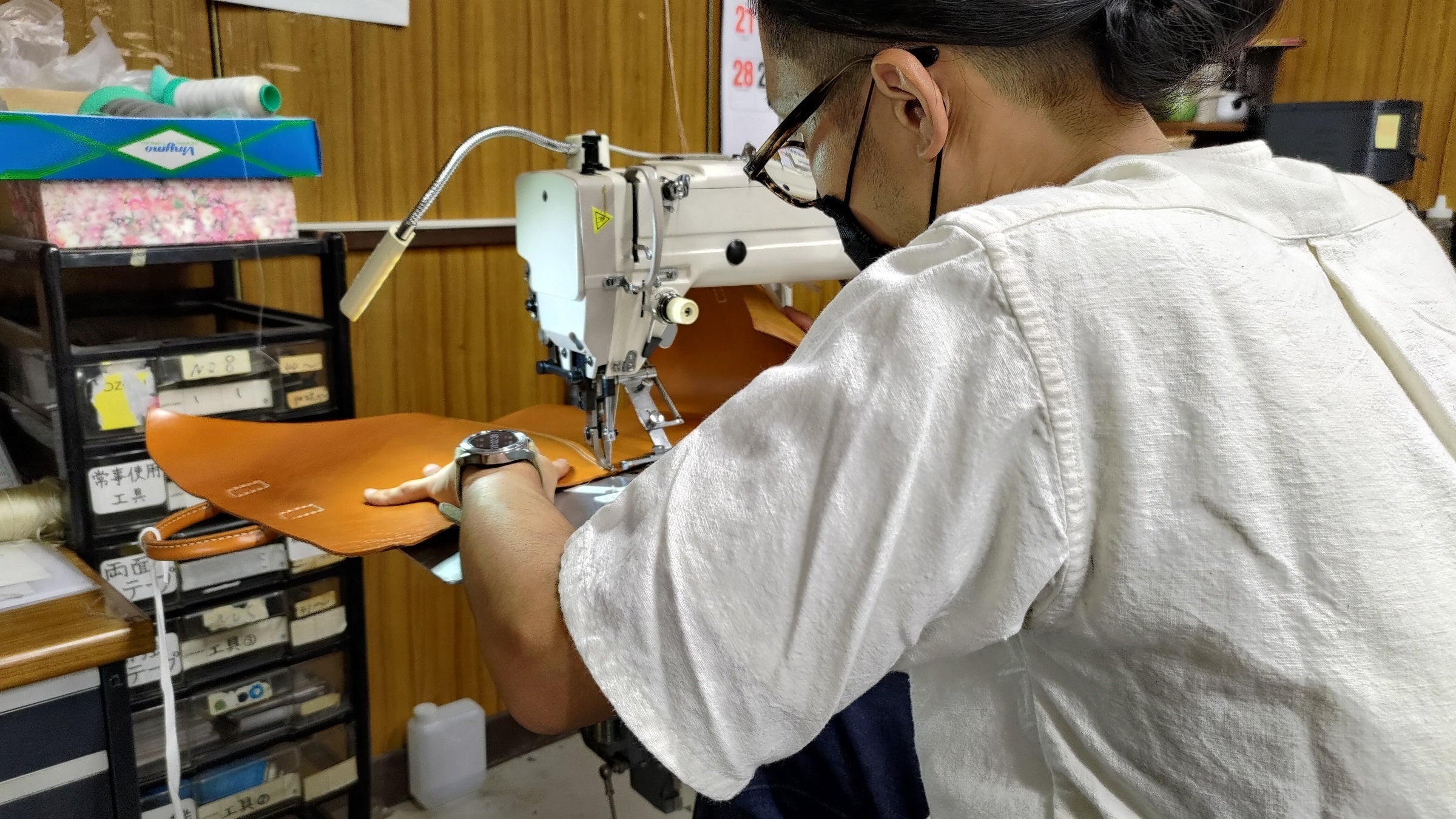 今回のプロダクトはモノづくりの街、台東区蔵前エリアにてこの道100年の歴史を誇る弊社:(株)増田の社内で、職人が丁寧に縫い上げています。