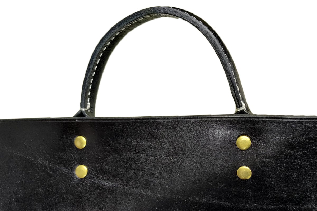 持ち手部分はカシメでの取り付けとなります。柔らかな真鍮風のメッキで、キャンプギアとの相性も抜群。あえて真鍮ではなく真鍮風のメッキを採用することで、革のお手入れ時にカシメをマスキングする必要がございません。