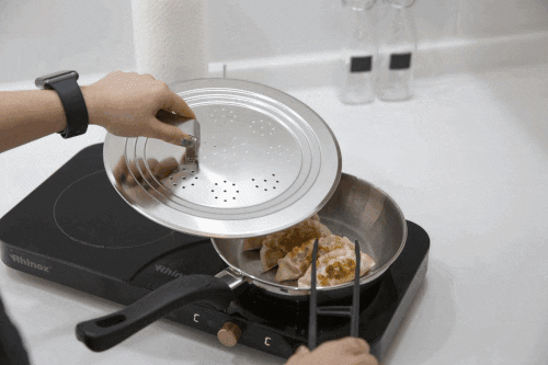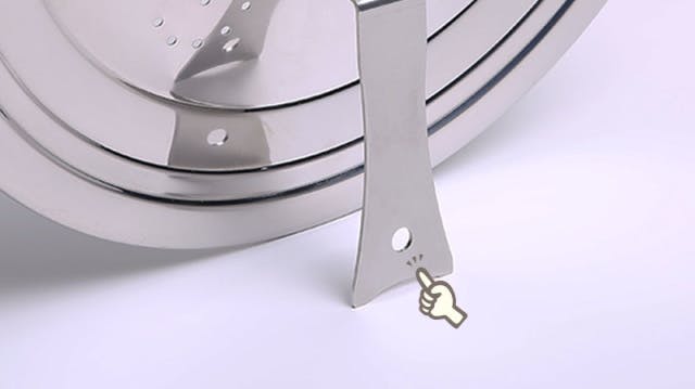 4BNKステンレスカバーは、スチームホールが水蒸気をスムーズに排出し、フタに水がたまったり、料理がべちゃっとしてしまわないよう、外はサクサク、中はジューシーに仕上げます。持ち手はフタを立てて置くことができ、より使い勝手が良いです。