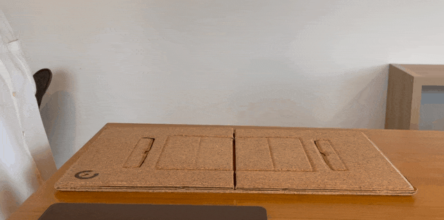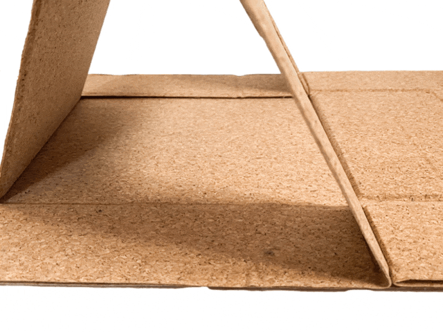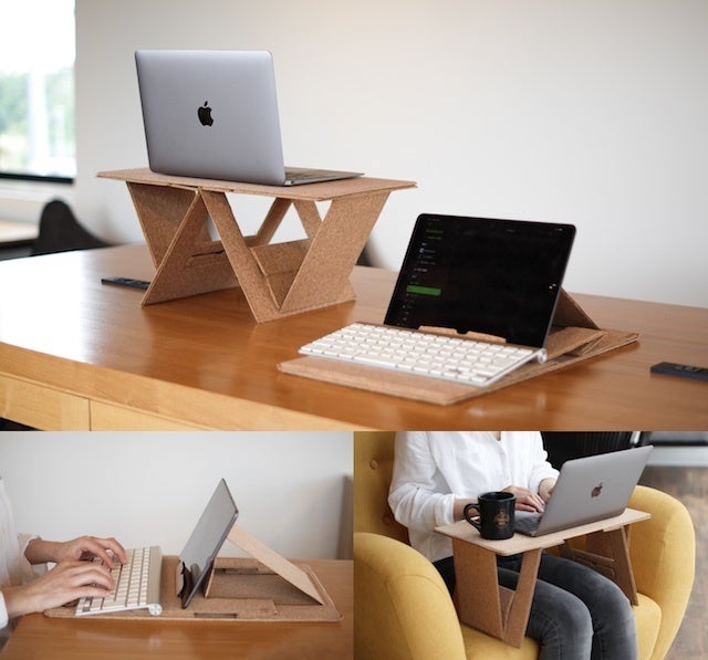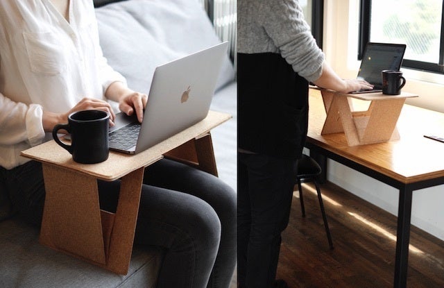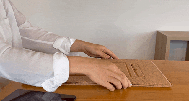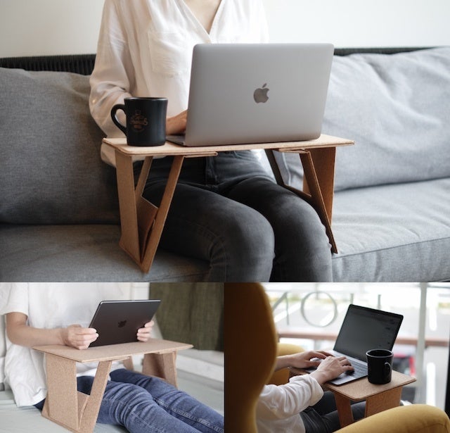 コルク生地のナチュラルな風合いと優しいホールド感が上に乗せたPCやコップをほどよくグリップし使いやすさも抜群。