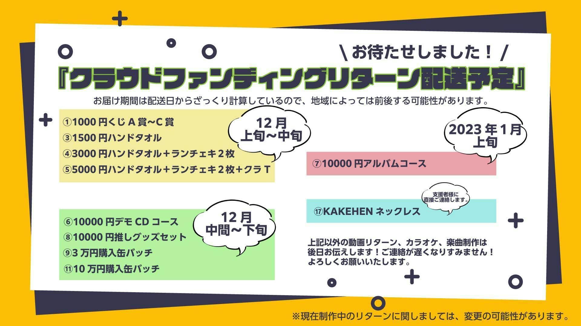 2022/12/01 17:00お待たせしております!!11/25のイベントでのリターンお渡しありがとうございました!ですが、お詫びも...。ご連絡いただいていたにも関わらず対応できていなかった皆様本当にすみませんでした!この度、郵送でのお届け目安が決まりましたので、お知らせします。こちらの配送予定よりも先にライブへのご来場がある方は、ご連絡いただければ会場でのお渡しも対応いたしますので、ご連絡お願いいたします。(直前のご連絡は対応できかねます。3日以上前ですと必ず対応できますので、ご利用下さい。)詳細は画像の通りです!動画リターンに関しましては、本日⑧10000円コースのMV動画個人ソロショット(新MV『お金』のソロ演奏シーン、フルヴァージョン5分程度の動画。)をご支援いただいた皆様にお届けいたしました!!本編と合わせてご覧いただけますと幸いです!他の動画に関しては、12月中のお届けを目標にしています。カラオケ配信は現在準備を進めておりますが、配信期間が確定しないため後日お伝えいたします。全てのリターンに関して、丁寧に手作りしていますので、ぜひ楽しみにお待ちいただけますと幸いです!!!! もっと見る曲名大発表!!!!!!