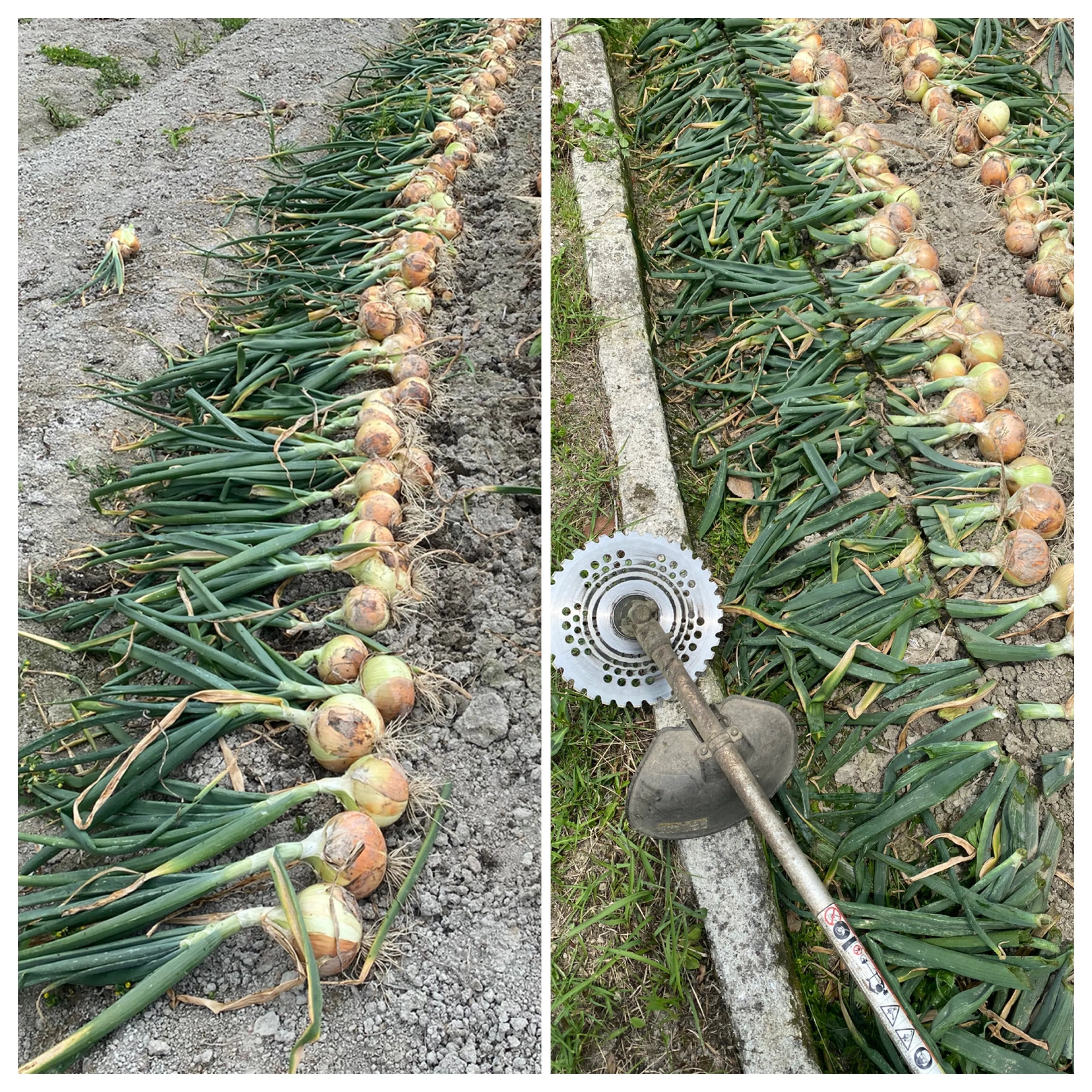 ・田んぼから抜いた玉ねぎの葉を綺麗に並べて、ある程度の長さに揃えるために草刈機で一気に切ります!