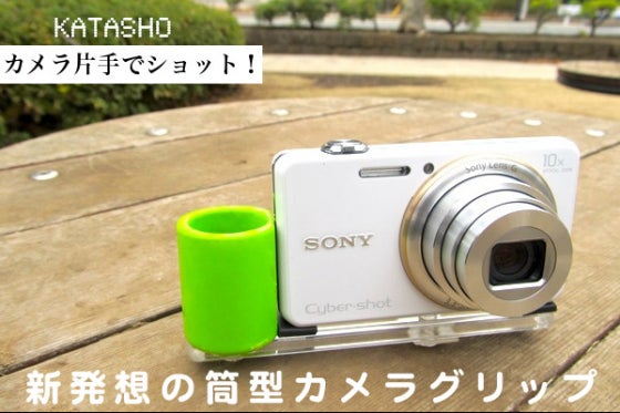 コンパクトカメラに取り付けるだけで使い勝手が向上する、新発想の筒型カメラグリップ。 それが「カメラ片手でショット!」です。