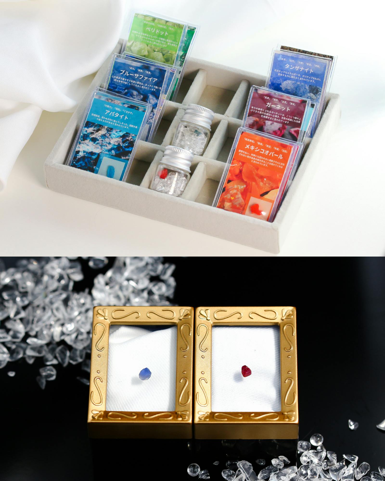 【宝石の原石お守り 18種、ルーペ 1個、浄化の小瓶 3個、コレクションケース 18個】