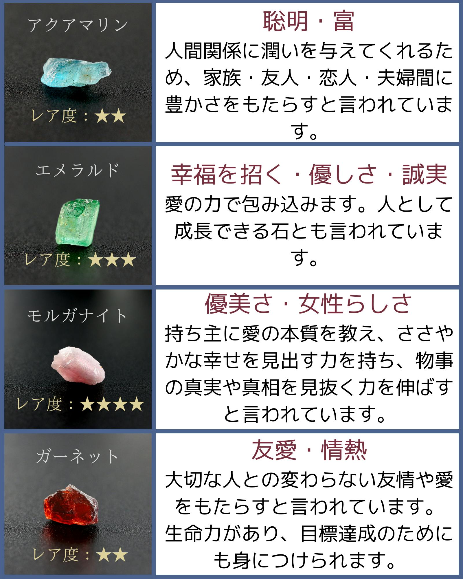 情熱の愛(ルビー)、優しさ(エメラルド)、知性(タンザナイト)、カリスマ性(ブラックオパール)、海の旅の安全(アイオライト)etc…