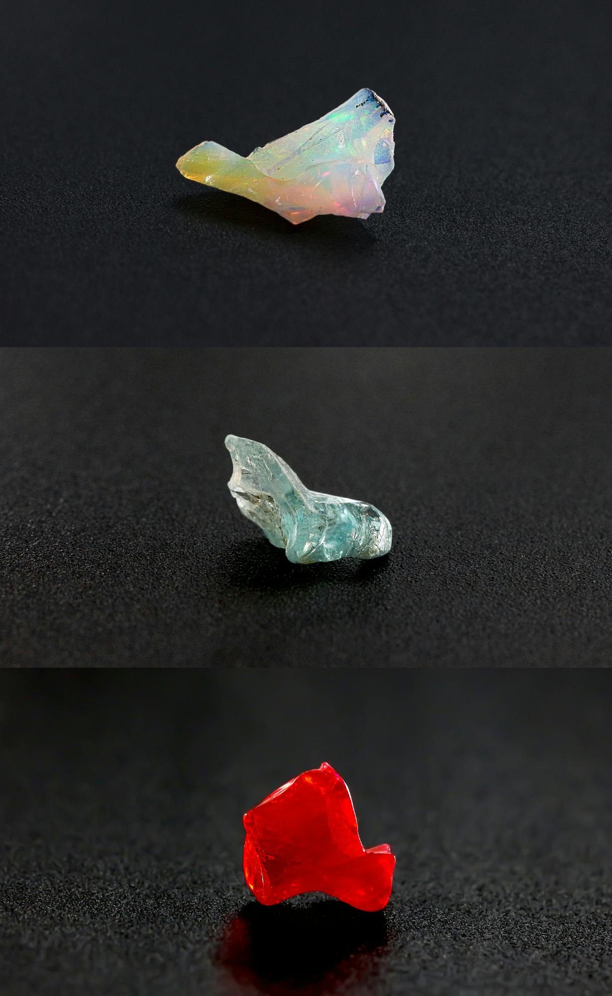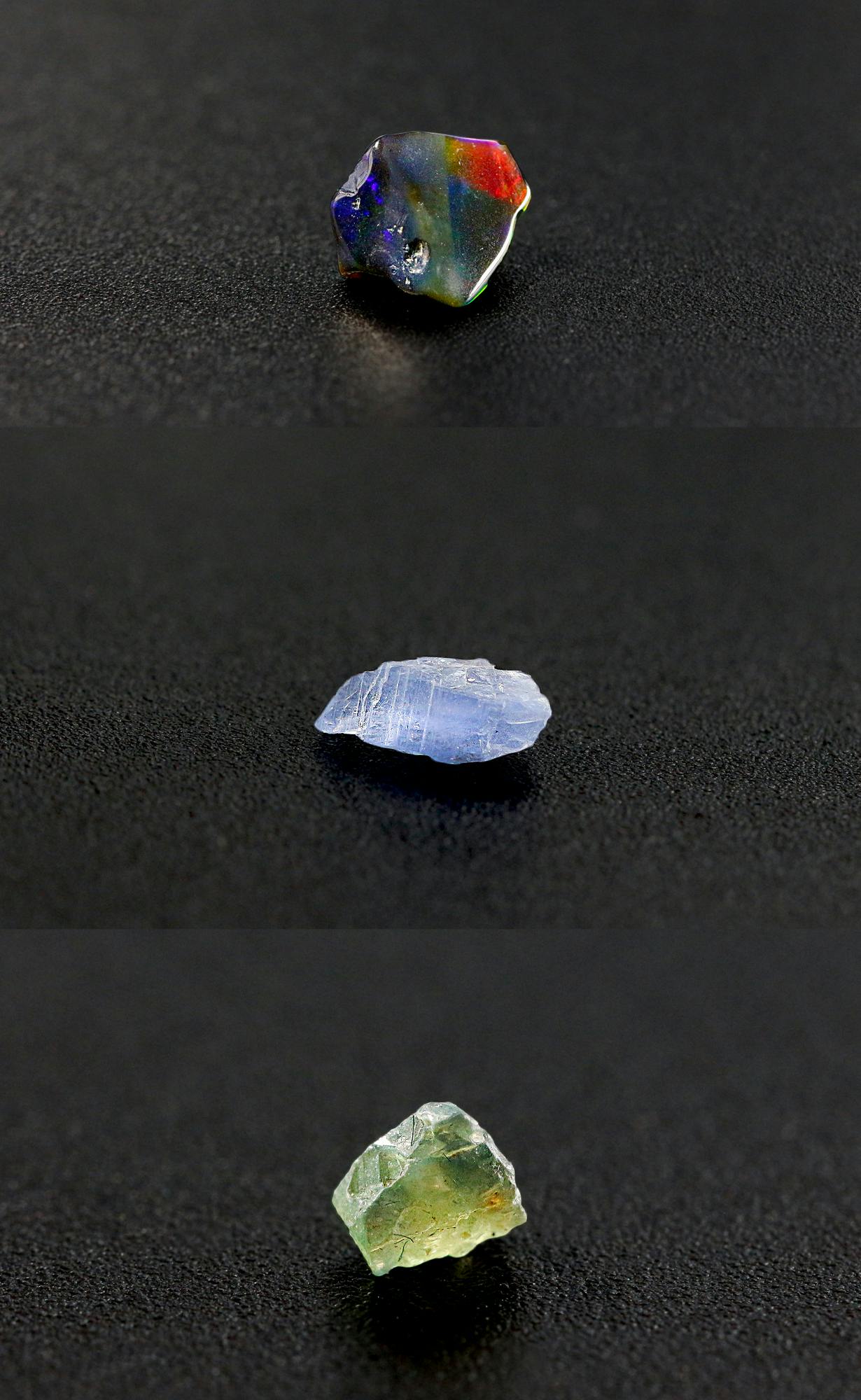 *画像 上から 「ブラックオパール」「ブルーサファイア」「アレキサンドライト」