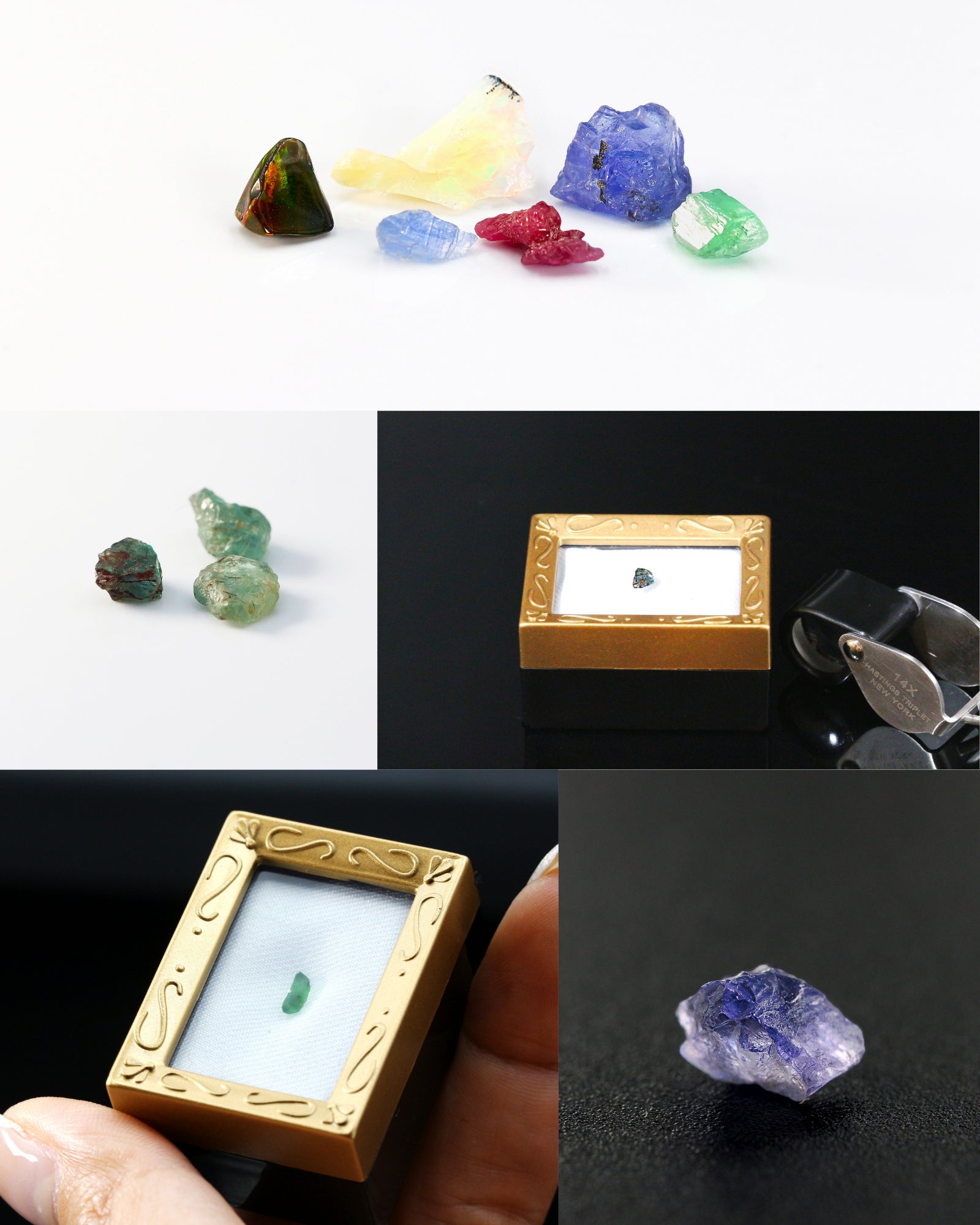 *画像 左上から「ウォーターオパール」、左下「タンザナイト」、真ん中上「ブラックオパール」、真ん中下「エメラルド」、右上「ルビー」、右下「アイオライト」