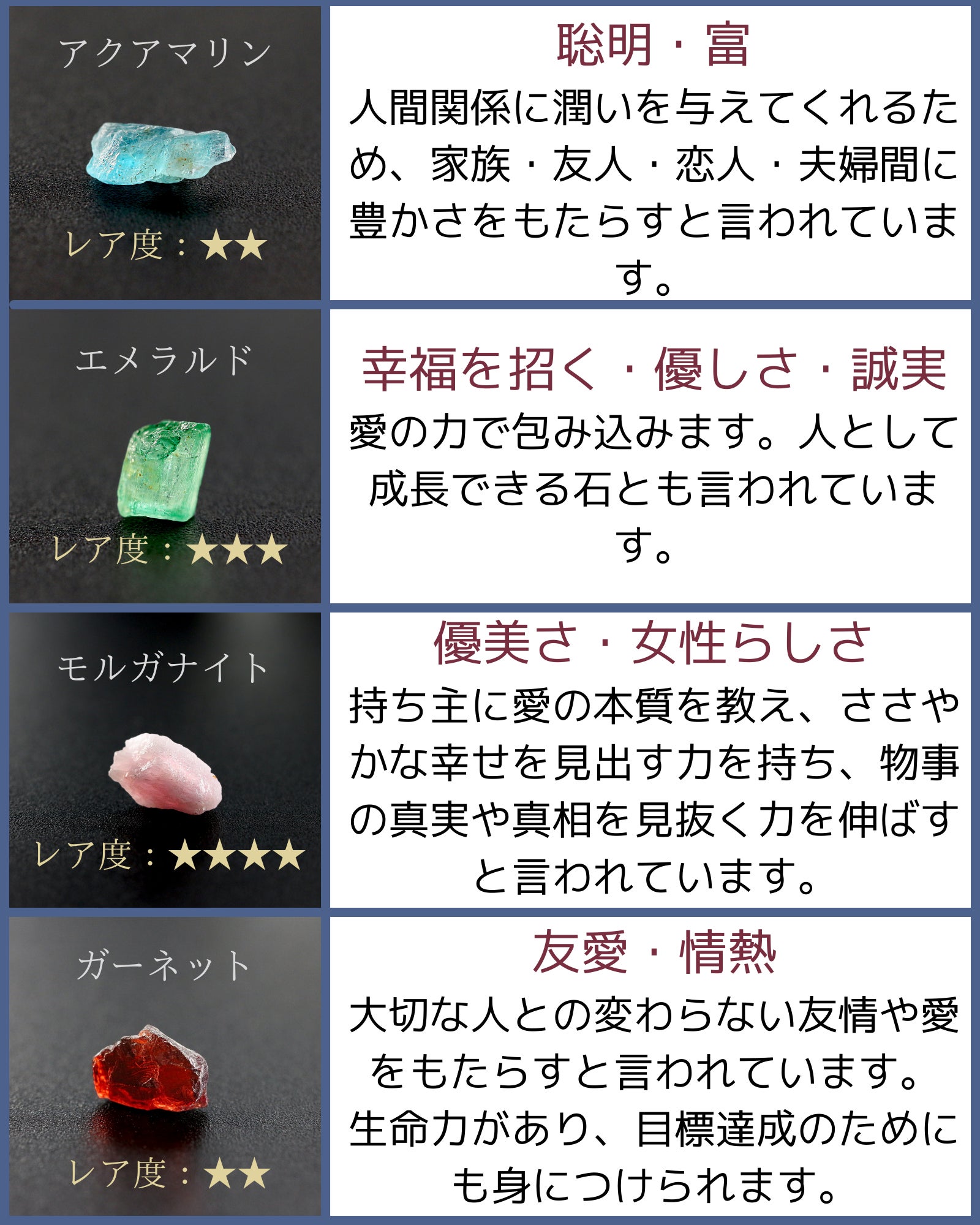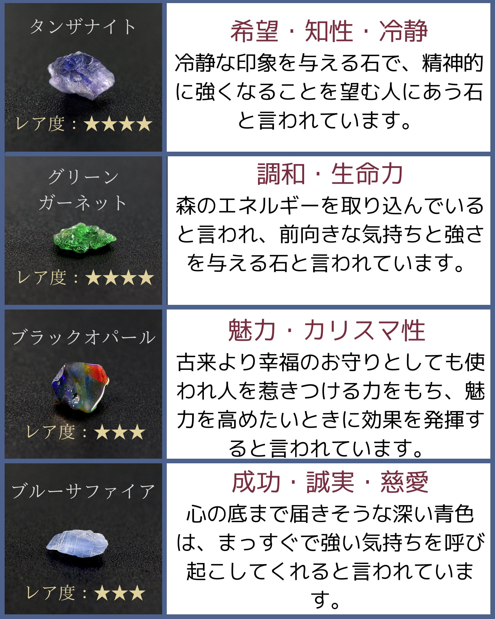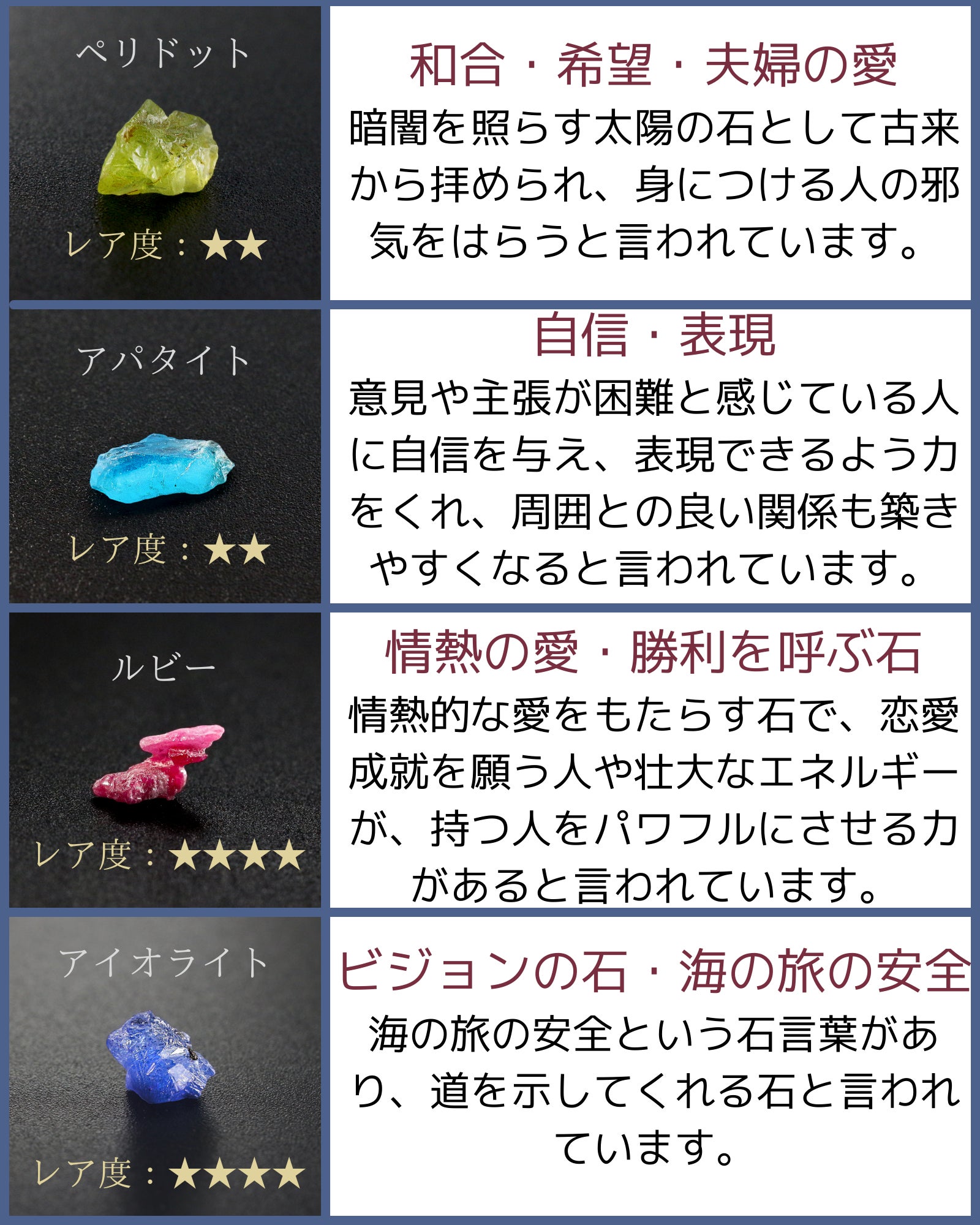 情熱の愛(ルビー)、優しさ(エメラルド)、知性(タンザナイト)、カリスマ性(ブラックオパール)、海の旅の安全(アイオライト)etc…