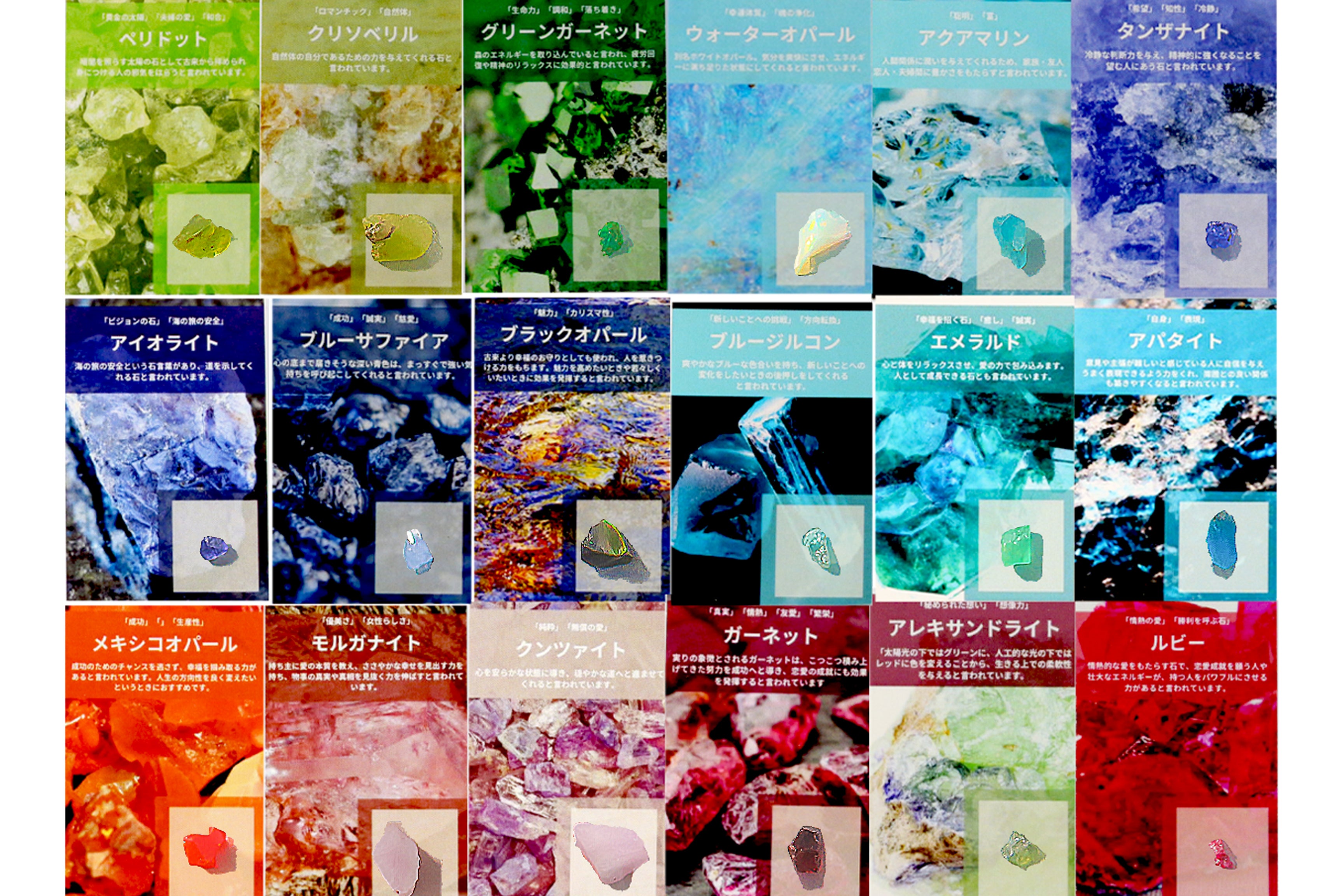 【宝石の原石お守り 18種、ルーペ 1個、浄化の小瓶 3個、コレクションケース 18個】