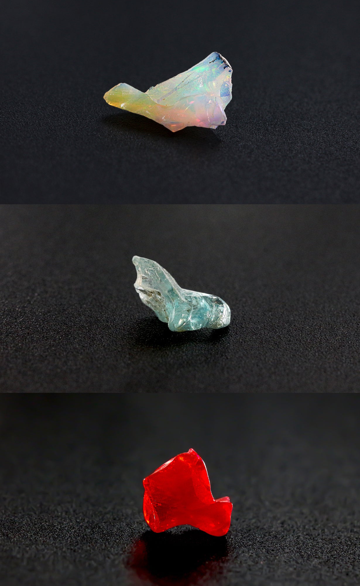 *画像 上から 「ブラックオパール」「ブルーサファイア」「アレキサンドライト」