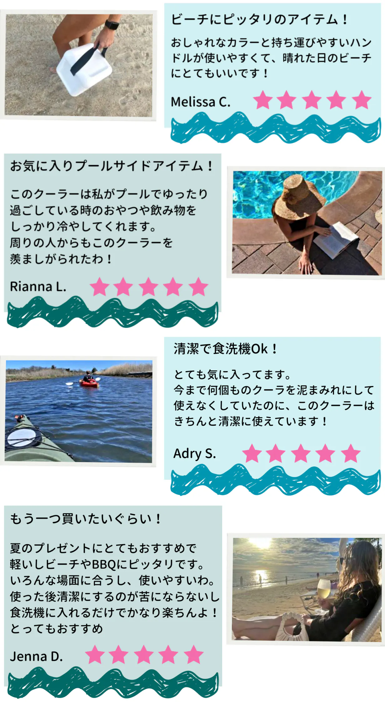 これだけ容量があるので、ビーチやプール、川やキャンプに行くときなど、飲み物や氷、食べ物をたくさん入れられます!