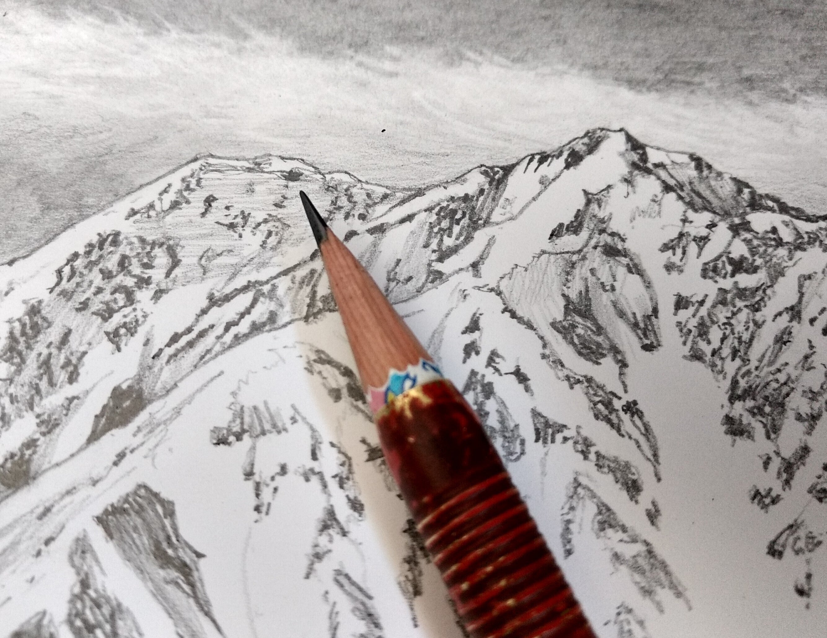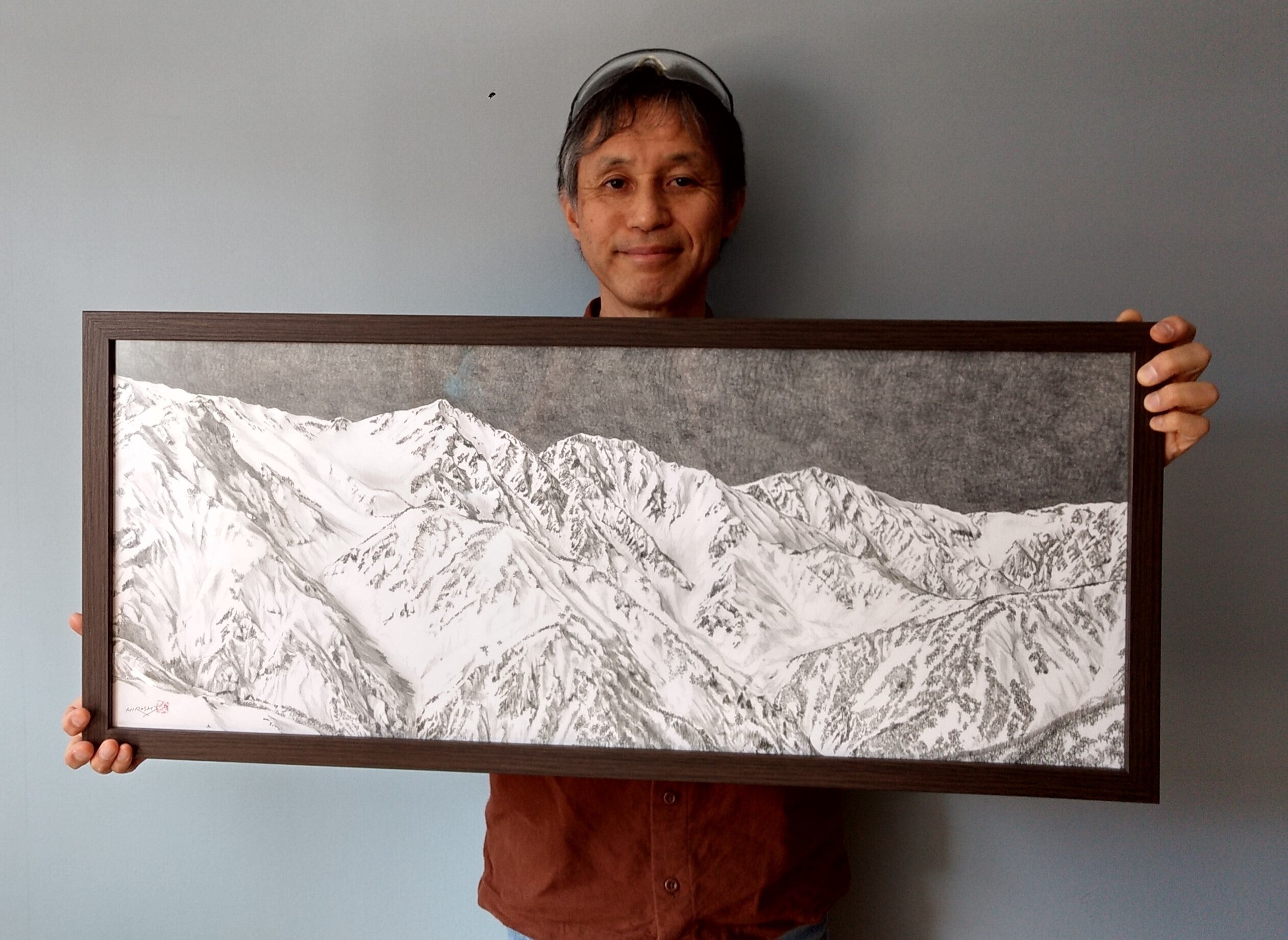 自身、作家としての原点である漫画の、原稿描きに使用していたケント紙と、ごく普通のHBの鉛筆一本だけで、もう一度山の絵に取り組もうと。しっかりとした絵が描けるうちに、自分が滅した後も、白馬の財産になるような絵を残したいと。愚直に、精細に白馬周辺の山々を描くことに没頭しました。