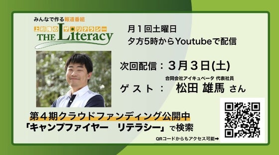 3月3日(土)17時から生配信! 上杉隆の「ザ・リテラシー」はゲストに合同会社アイキュベータ代表社員の松田雄馬さんをお迎えします。 MC:上杉隆 アシスタント:宇都宮愛 Youtube、SHOWROOMより生配信(前半)です。 https://www.youtube.com/channel/UCP-t5I7mMditAKYN4QR3iUQ https://www.showroom-live.com/t_literacy ※番組後半は第4期クラウドファンディングへご支援を賜りました皆様へのリターンとして限定配信を行っています。
