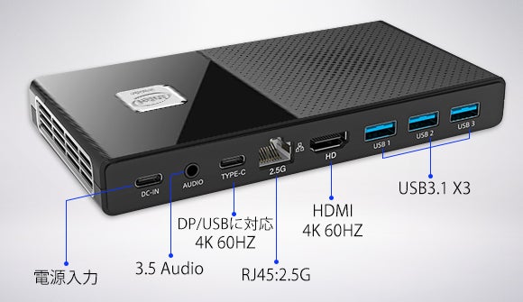 電源、USB3.1 * 3、HDMI:4K/60Hz、LAN/Ethernet:2.5G、3.5mmイヤホンジャック