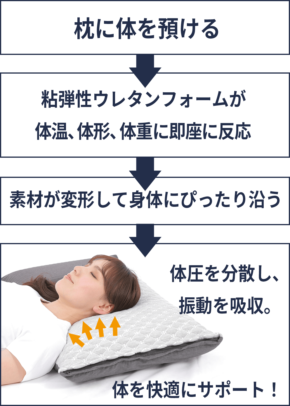 体重と自然に加えられた圧力へ瞬時に反応し、ゆっくりと元に戻る性質は、枕を始め、マットレスなどさまざまな寝具に応用されています。