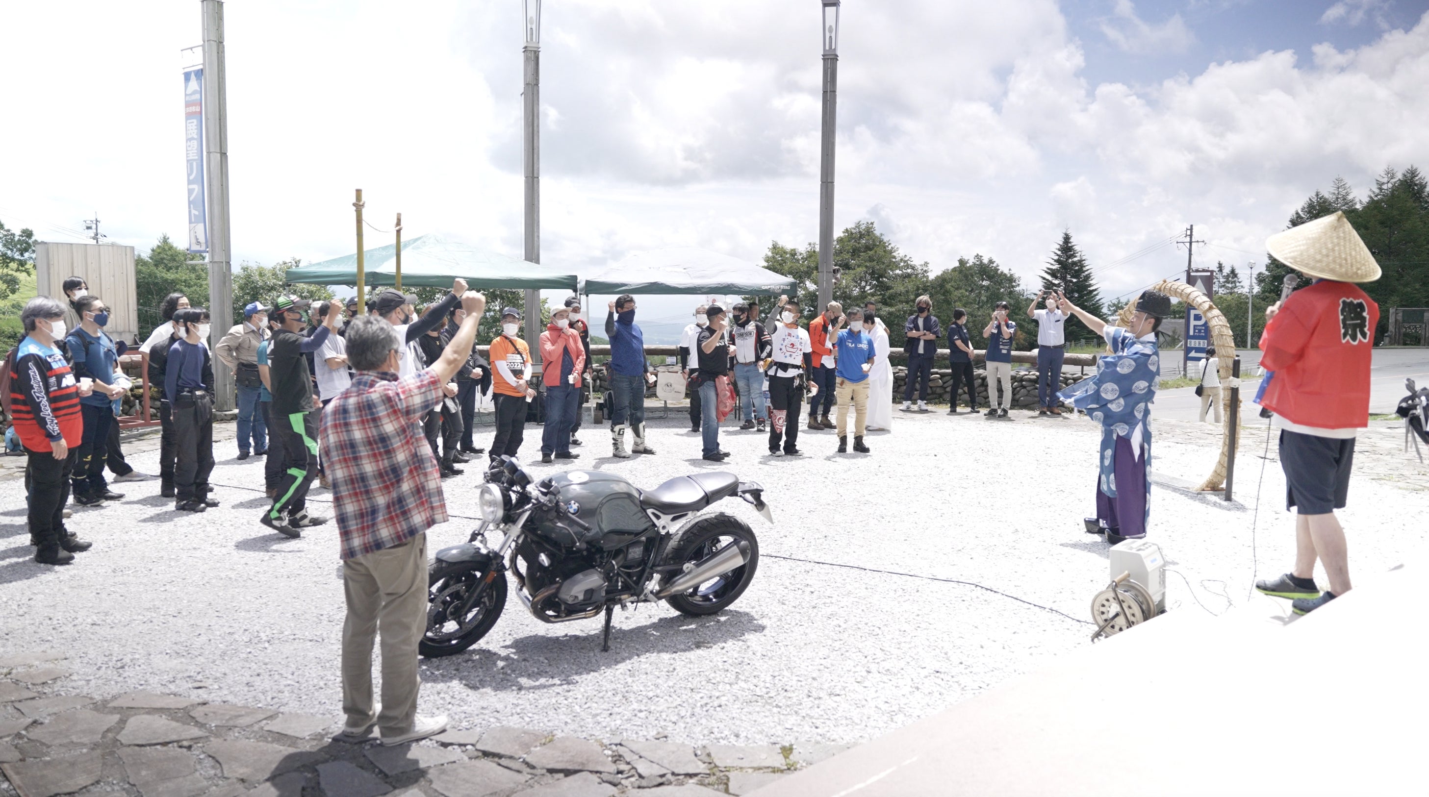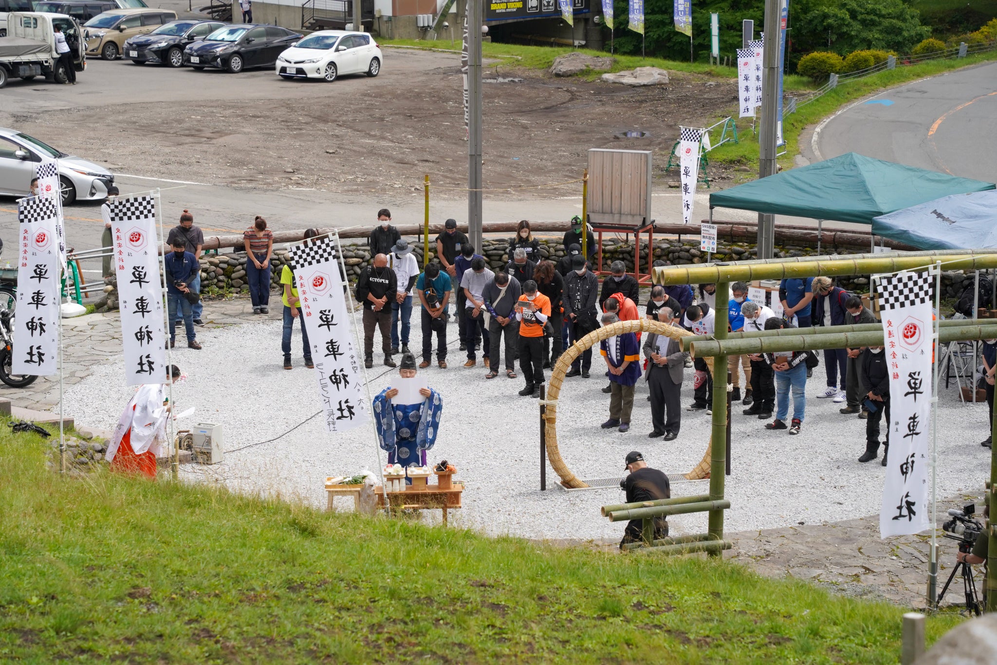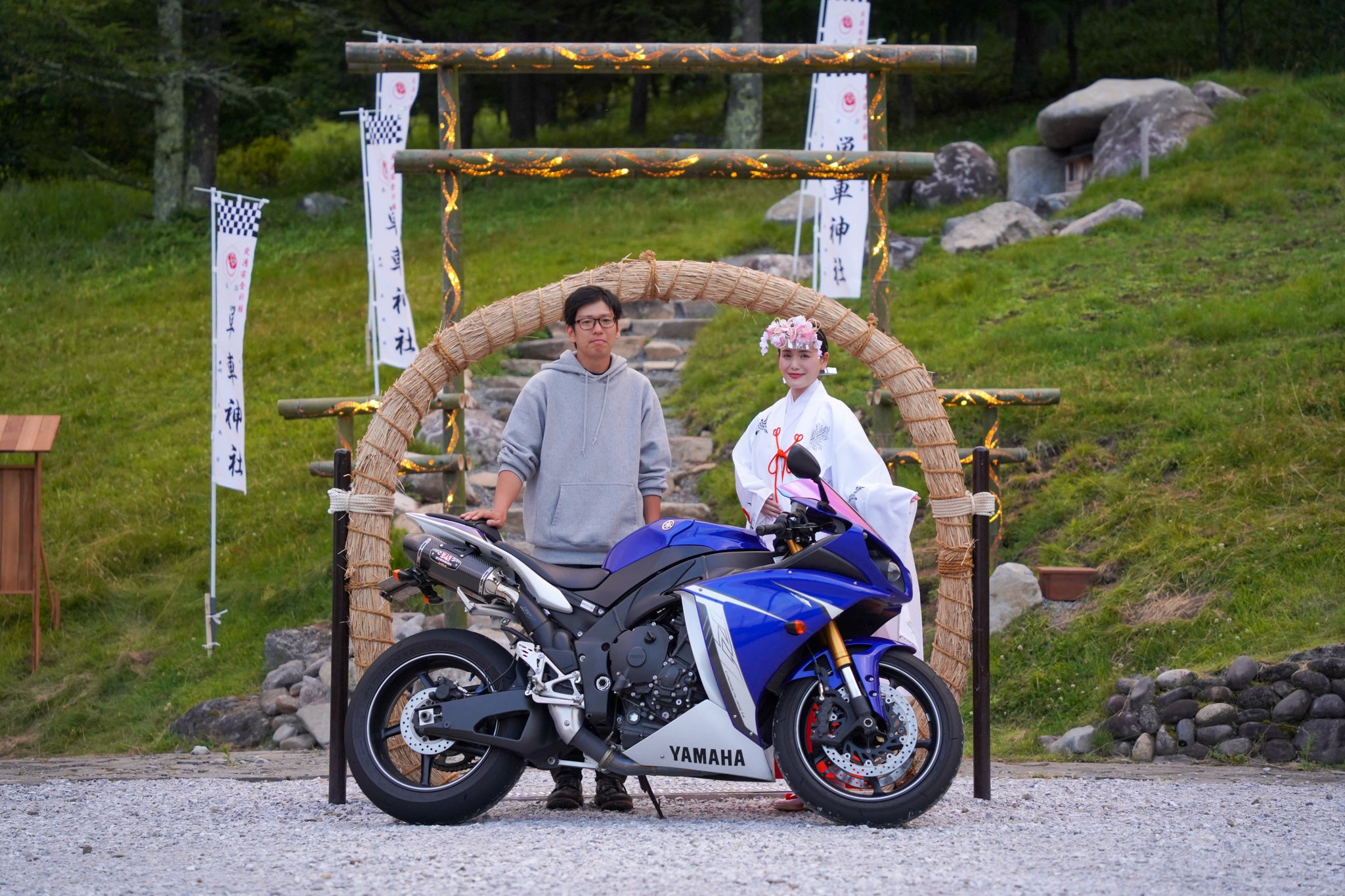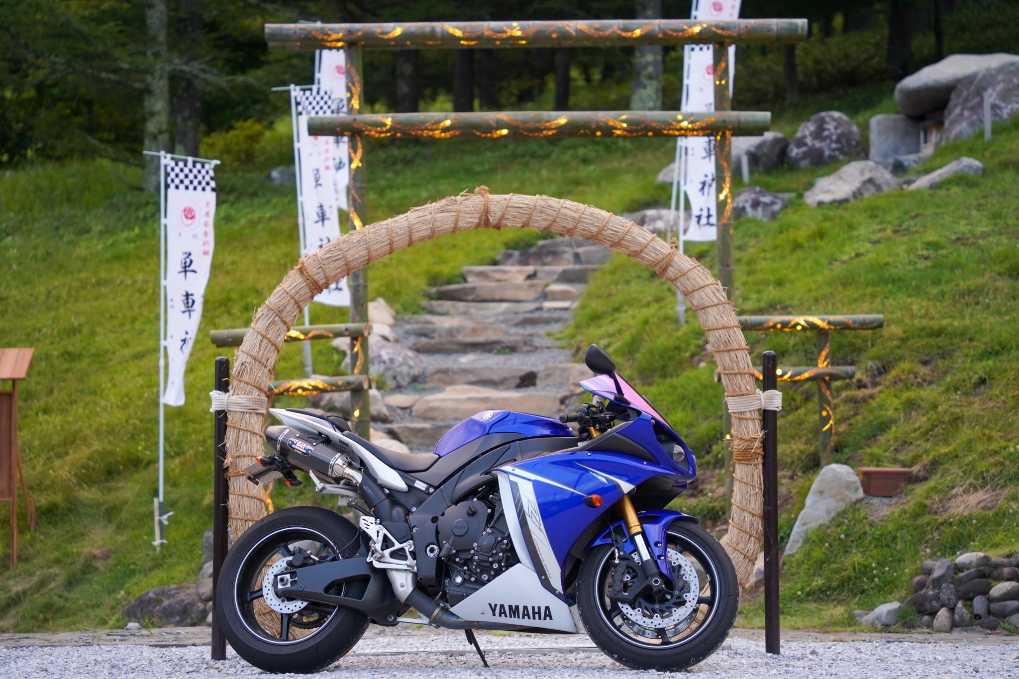 この度、単車神社は、竹灯り鳥居、愛車と共にくぐる茅の輪、レーシングフラッグと日本の美をモチーフにしたのぼり旗などを建設させていただき、より神社としての「場」作りに注力させていただきました。