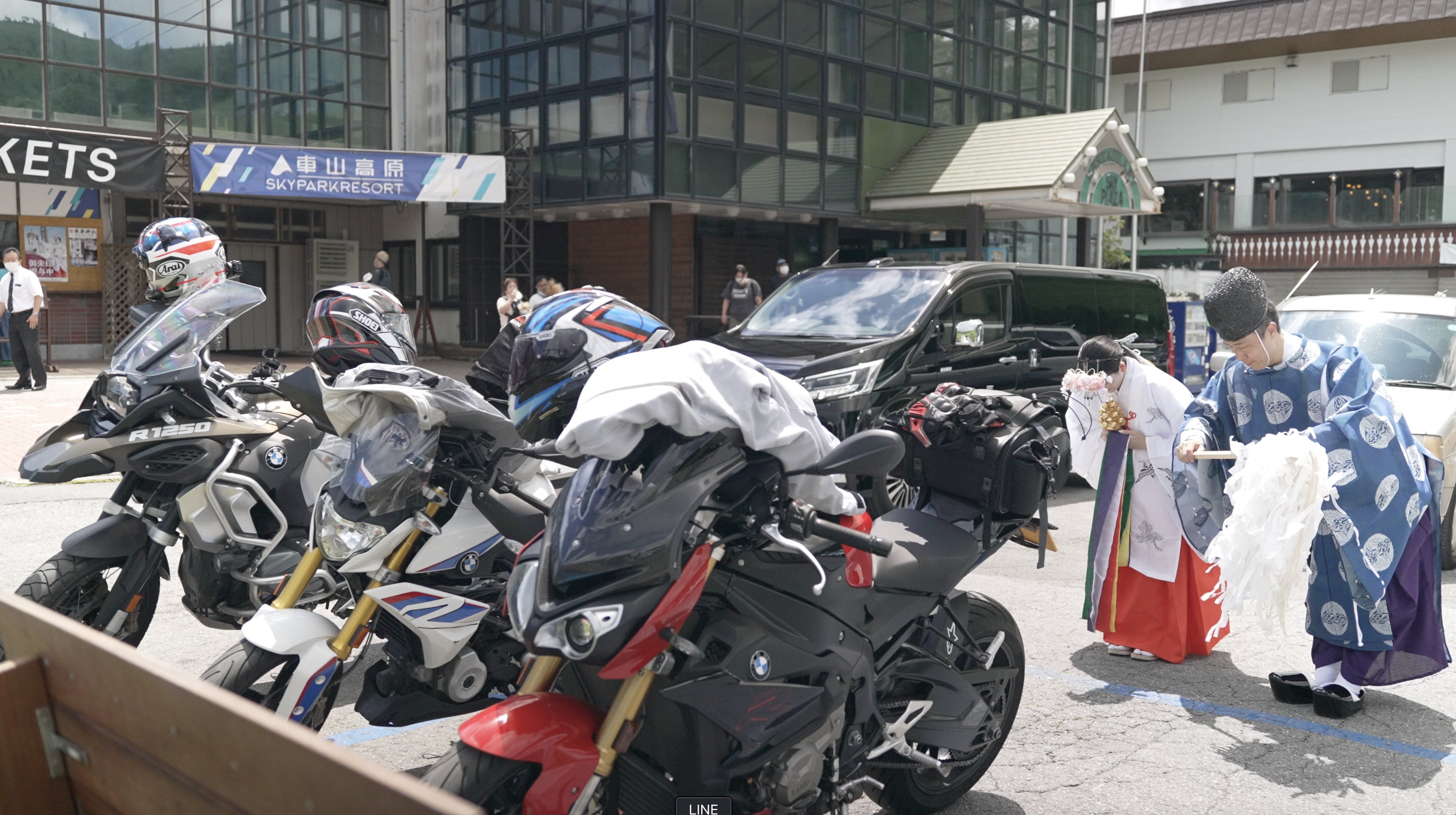 神主と巫女が、ご参列いただいた方々の愛車を厄払いさせていただきました。