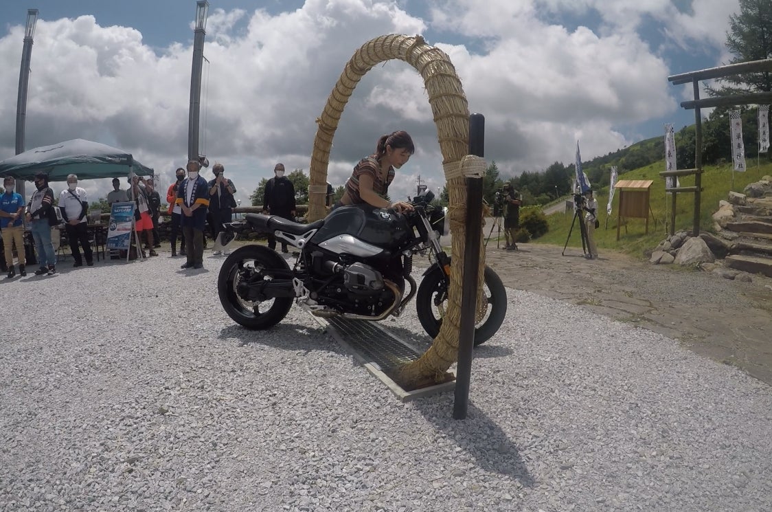 参拝者代表の方に、バイクと一緒にくぐれる茅の輪の「初くぐり」をしていただきました。