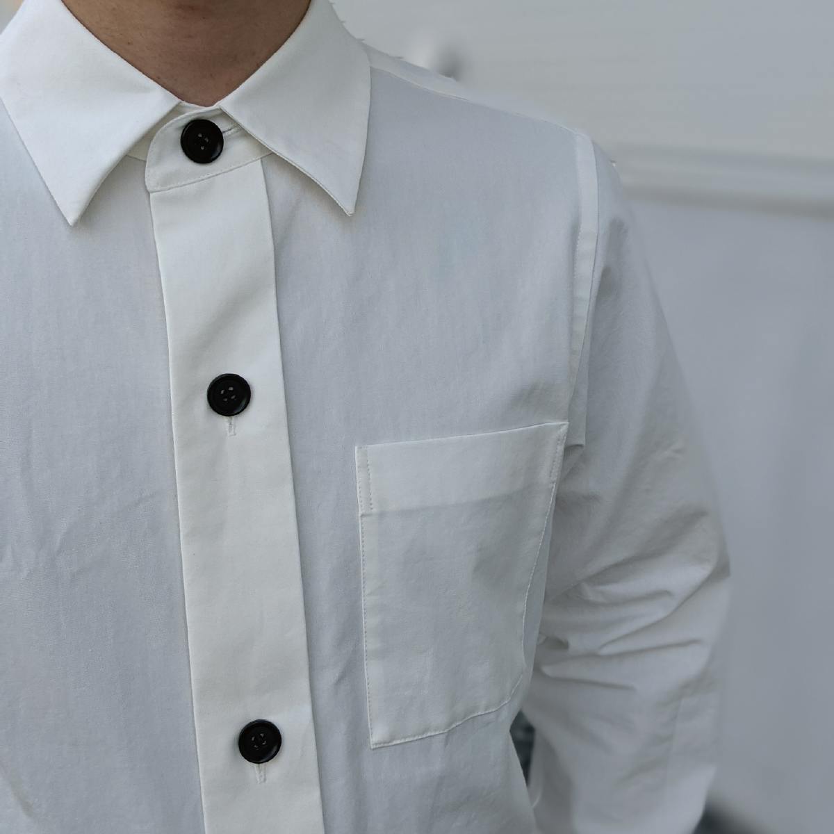 こちらのアイテムの特徴は前立てで、幅を5cmと広めに設定し、通常のシャツとは異なり外側に折り返されています。