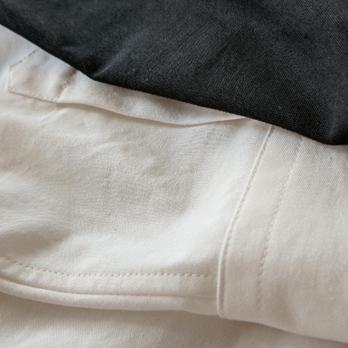 今回のナットボタンは天然素材特有の模様が見えるように、限りなく黒に近いブラウンがかったグレーを採用しました。ホワイトシャツ・ブラックシャツ共通で使用しています。