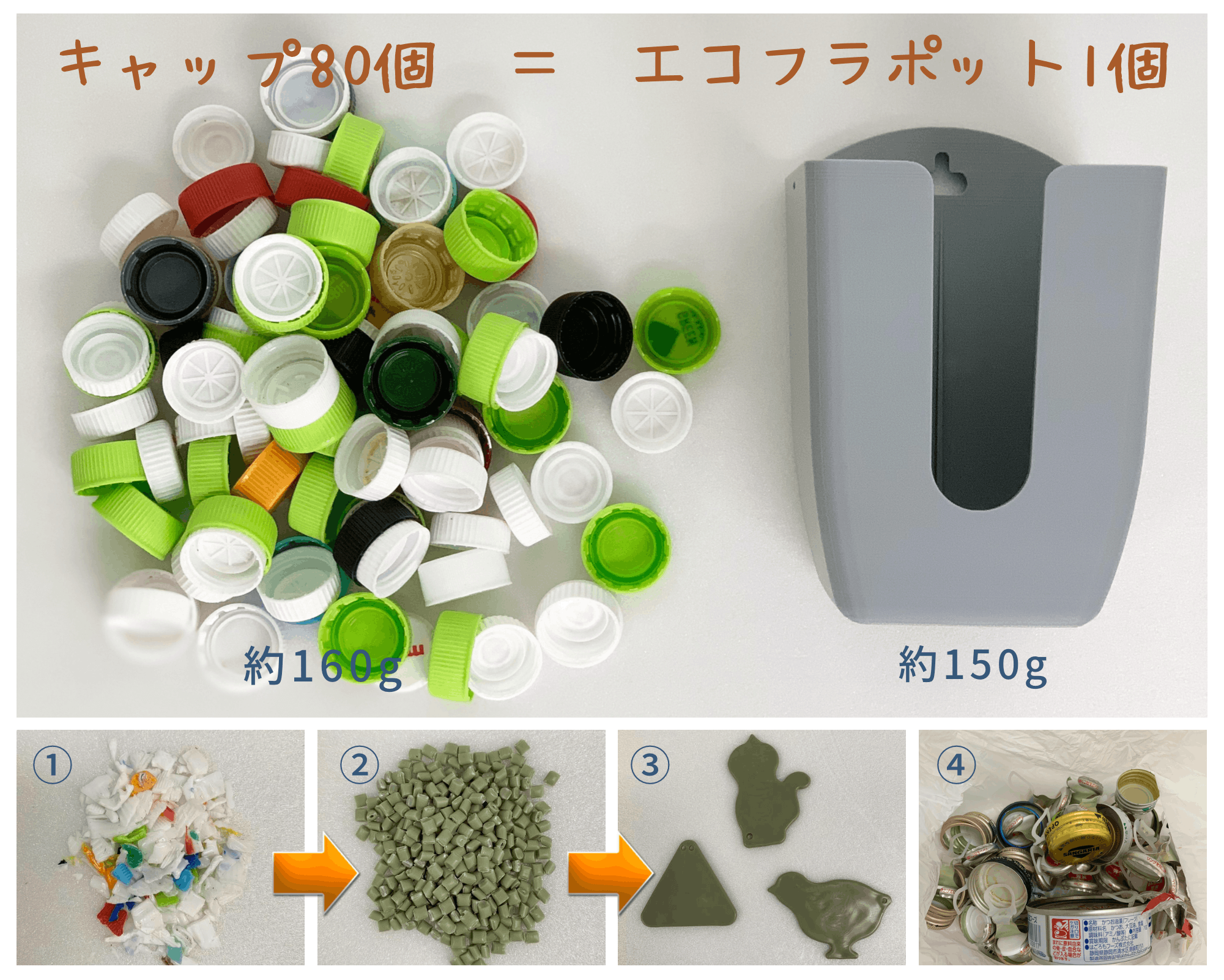 そこで、重さを測って比べてみました。答えは約80個!エコフラポットの重さは約150g、成型時に出るランナーを含めると約160gの樹脂が必要です。キャップは1個約2gなので約80個で1個のエコフラポットができることになります。80本のペットボトルってなかなかの量ですが、夏場だと特にあっという間に溜まってしまうかもしれませんね。