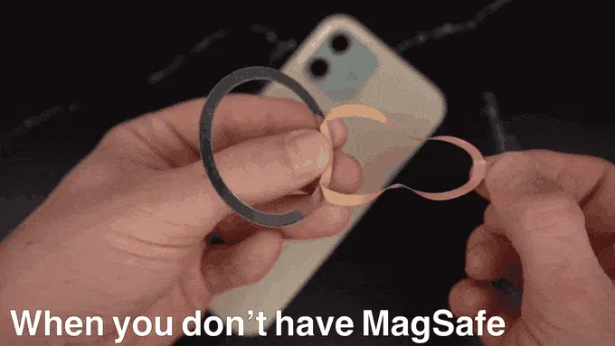 スマートフォンまたはスマートフォンケースにMagSafeが搭載されていない場合、MagSafeと互換性を持たせるために、スマートフォンまたはケースの背面に鉄製のリングを貼り付ける必要があります。 リングはパッケージに同梱されています(※スマートフォン/ケースの形状・素材によってはリングが取り付けできない場合がございます)。