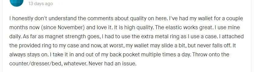 私は今(11月から)数ヶ月間 『eLuseforウォレット』を使っていて、それが大好きです。高品質です。ゴムストラップは素晴らしい働きをします。私は毎日使用しています。磁石の強さに関しては、ケースを使うので金属リングを使わなければなりませんでした。付属のリングをケースに取り付けたのですが、決して落ちることはありません(最悪の場合、スマホから少しずれる可能性はありますが)。常に接着したままです。私は1日に何度も後ろのポケットに出し入れします。さらには、カウンター/ドレッサー/ベッドに投げ置いてもいます。しかし、全然問題はありませんでした。